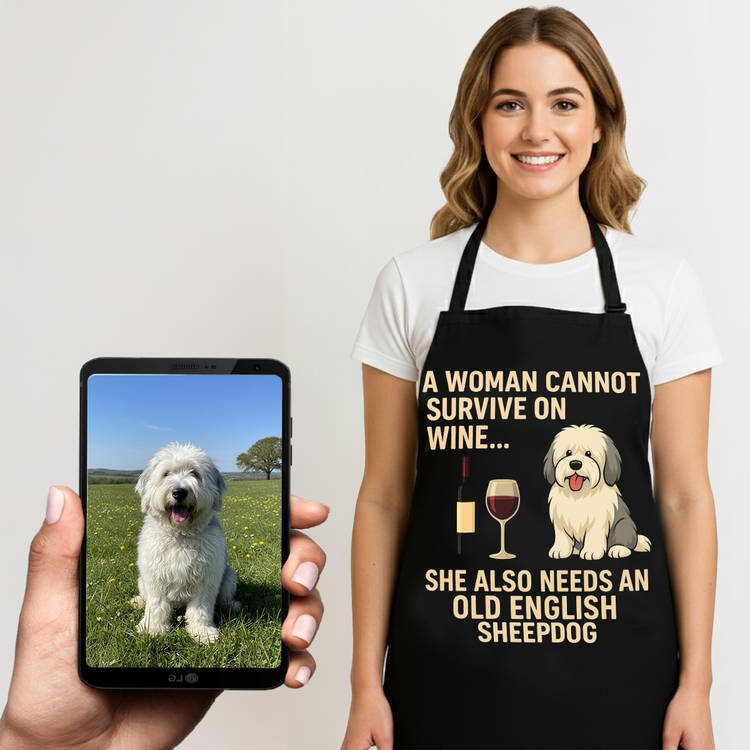 Personalized “A Woman Cannot Survive on Wine…” Old English Sheepdog Apron-Accessories-Accessories,Apron,Dog Mom Gifts,Old English Sheepdog,Personalize Artwork-1
