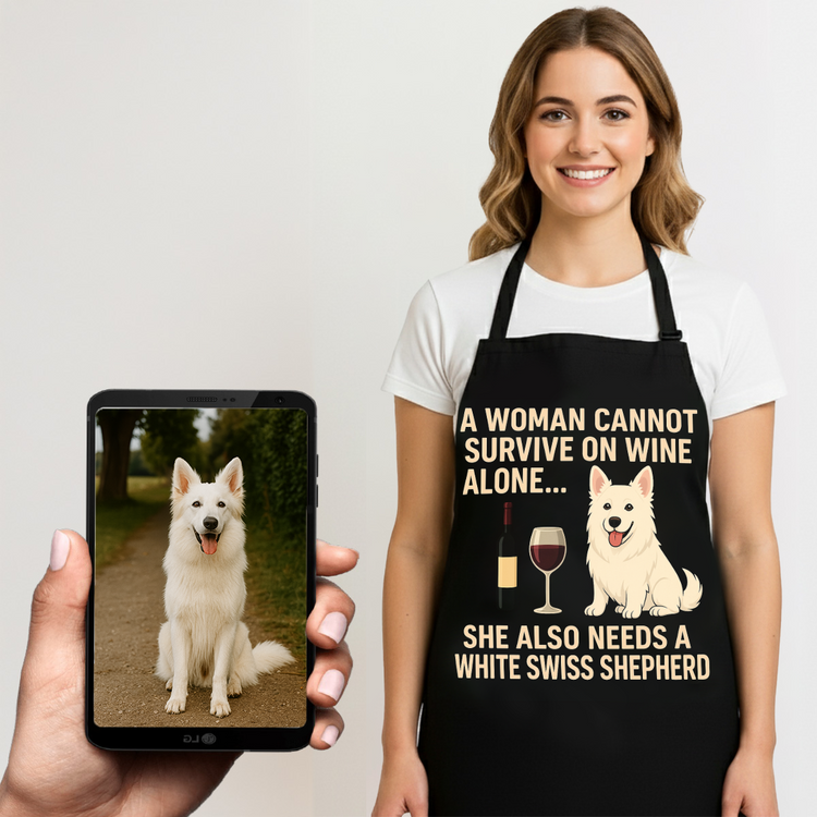 Celebrate your love for your White Swiss Shepherd with our Personalized “A Woman Cannot Survive on Wine Alone… She Also Needs a White Swiss Shepherd” Custom Dog Apron. This unique apron is perfect for dog lovers who enjoy cooking or entertaining while showcasing their bond with their furry friend.