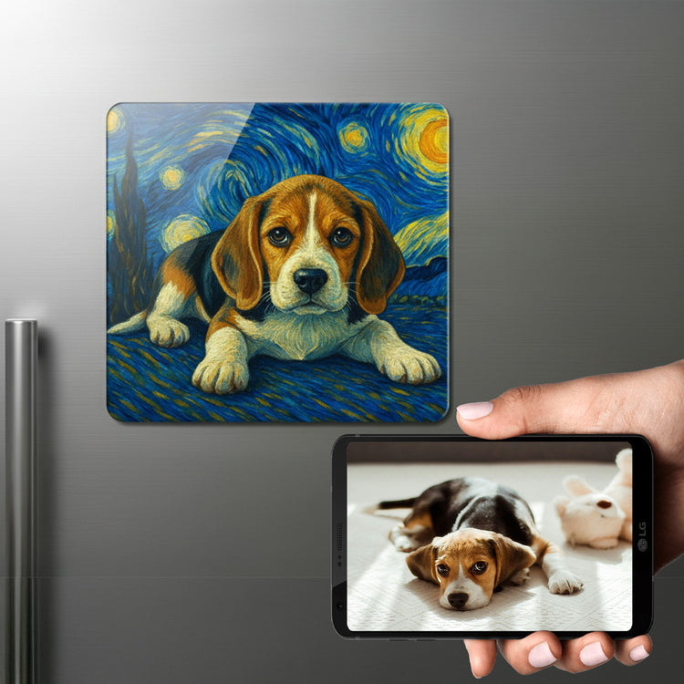 Transform your love for your Beagle into a stunning piece of art with our Personalized Starry Night Artwork — Custom Dog Fridge Magnet. This unique magnet captures the essence of your furry friend, bringing joy to your kitchen every day.