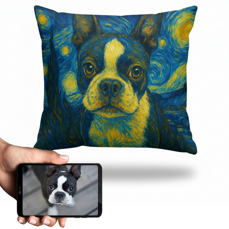 Transform your love for your Boston Terrier into a stunning piece of art with our Personalized Starry Night Artwork Custom Boston Terrier Pillowcase. This unique creation captures the essence of your furry friend in Van Gogh's iconic style, making it a heartfelt addition to your home.