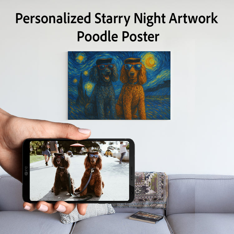 Transform your cherished memories into stunning art with our Personalized Starry Night Artwork featuring your beloved Poodle. Send us a photo of your Poodle, and we’ll create a unique masterpiece that captures the essence of your furry friend.