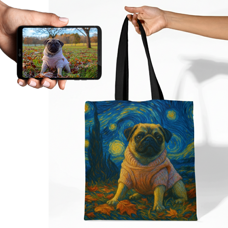 Simply upload 1–3 photos of your Pug, and we’ll transform them into stunning Van Gogh-inspired artwork. Each bag is printed on both sides, ensuring your love for your furry friend is always on display.