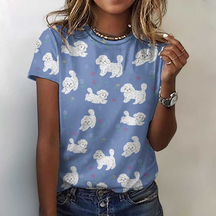 Playful Poodles in a Garden Stroll Women's Cotton T-Shirt-Apparel-Sky Blue-2XS-15