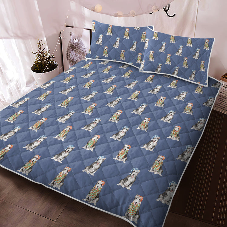This Watercolor Black White Bull Terriers Christmas Quilted Bedding Set features a beautiful watercolor Christmas pattern of Bull Terriers. The dogs are adorned with red and blue Christmas hats, scarves, and festive accessories, adding a cheerful touch to your bedroom decor.