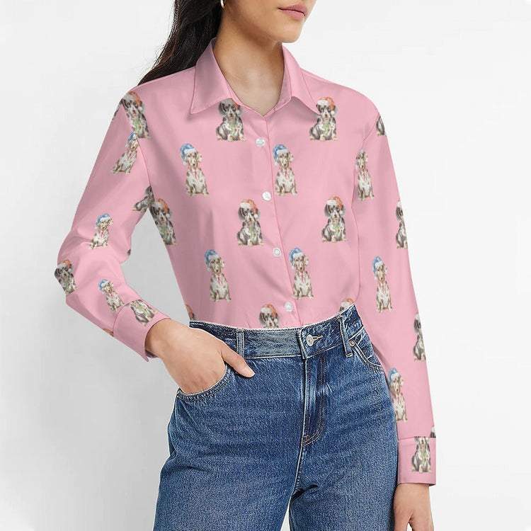 Featuring a beautiful watercolor Christmas pattern of Piebald Dachshunds, this shirt captures their playful spirit. The dachshunds are adorned with red and blue Christmas hats and scarves, adding a joyful touch to the design.