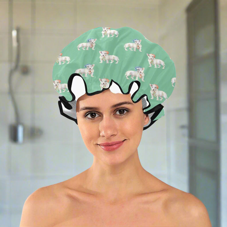 Featuring a beautiful watercolor Christmas pattern of Bull Terriers, these shower caps are a perfect blend of holiday spirit and canine charm. The Bull Terriers are adorned with red and blue Christmas hats, and festive accessories like Christmas lights.