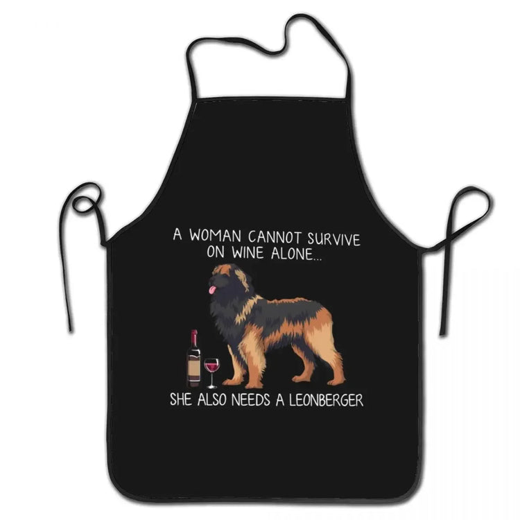 Featuring the witty quote, "A woman cannot survive on wine alone... she also needs a Leonberger," this apron is perfect for dog lovers who appreciate a good laugh.