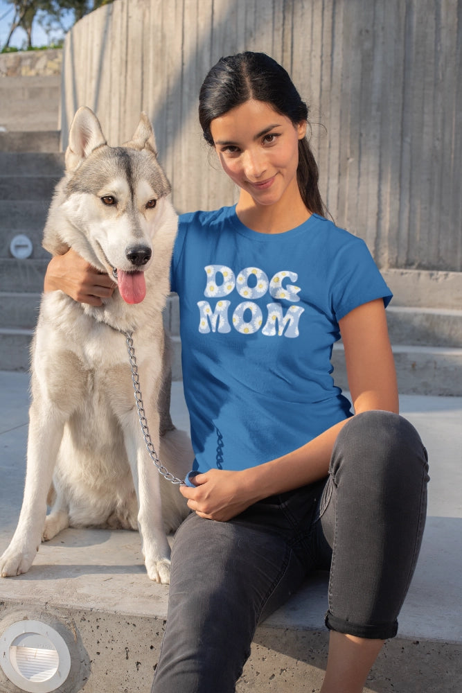 Made from high-quality cotton, it's both durable and comfortable, ensuring that you can wear it time and time again. Plus, its unique "Dog Mom" text filled with blue floral print adds a touch of personality and style to any outfit.