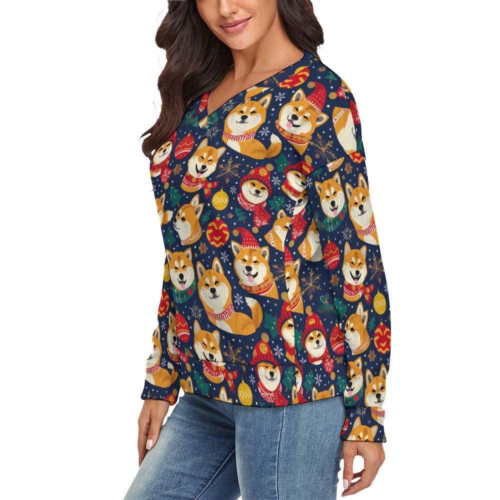 Merry Shiba Soiree Women's V-Neck Christmas Sweater