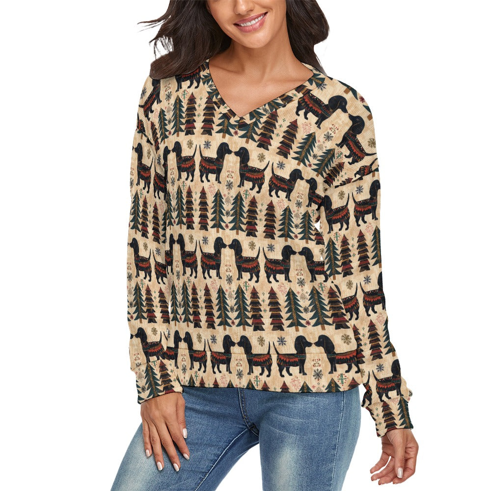Yuletide Kisses Black Tan Dachshunds Women's V-Neck Christmas Sweater
