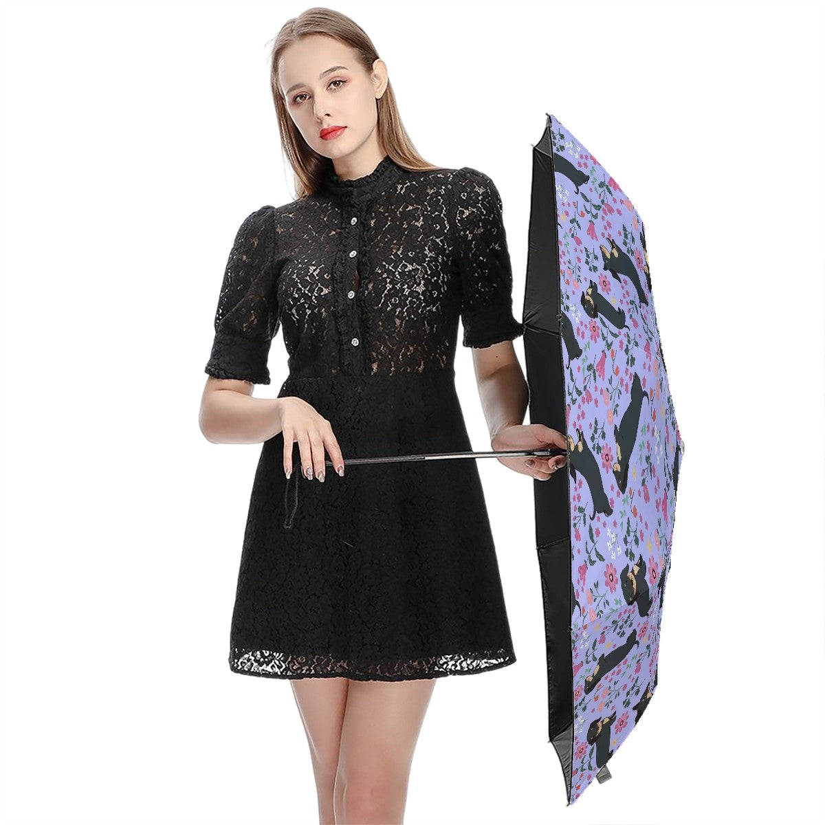 Featuring a charming design of playful Dachshunds amidst vibrant flowers, this umbrella is perfect for brightening up rainy days. Its compact size makes it ideal for everyday carry, ensuring that your loved one can showcase their passion for Dachshunds wherever they go.