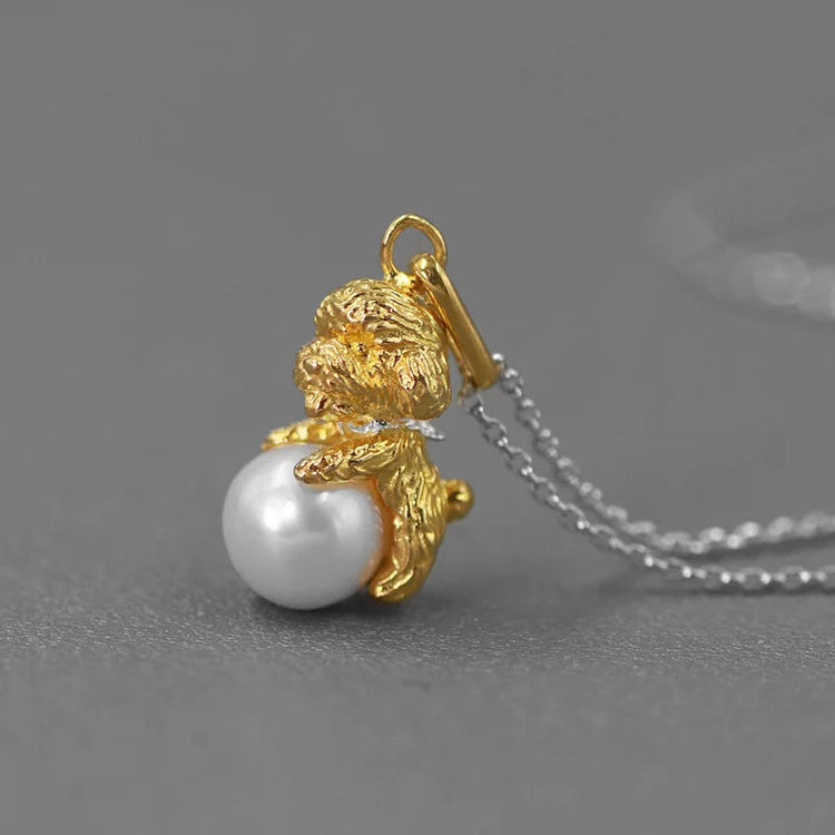 Playful Doodle / Toy Poodle Love Silver Necklace and Pendant with Natural Pearl
