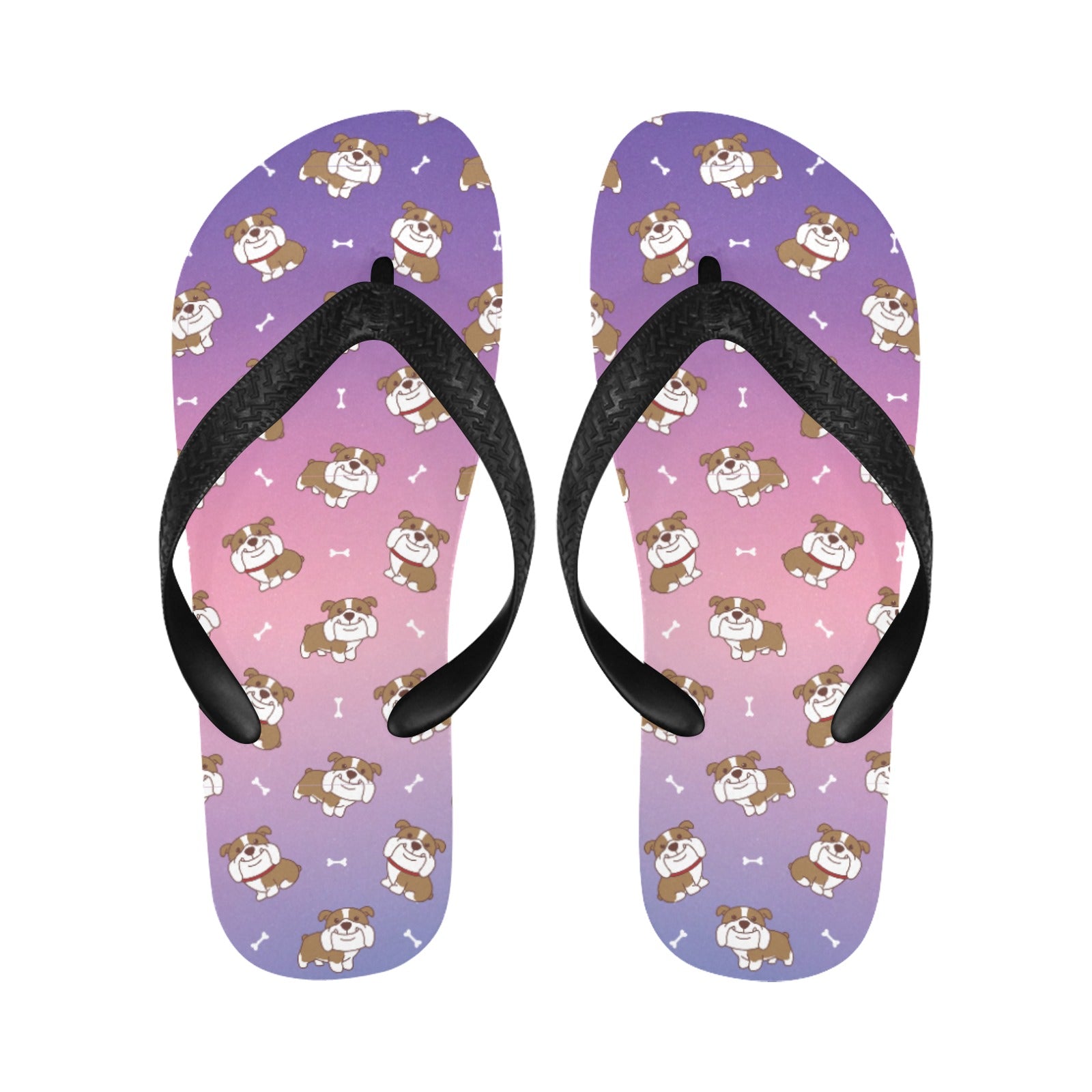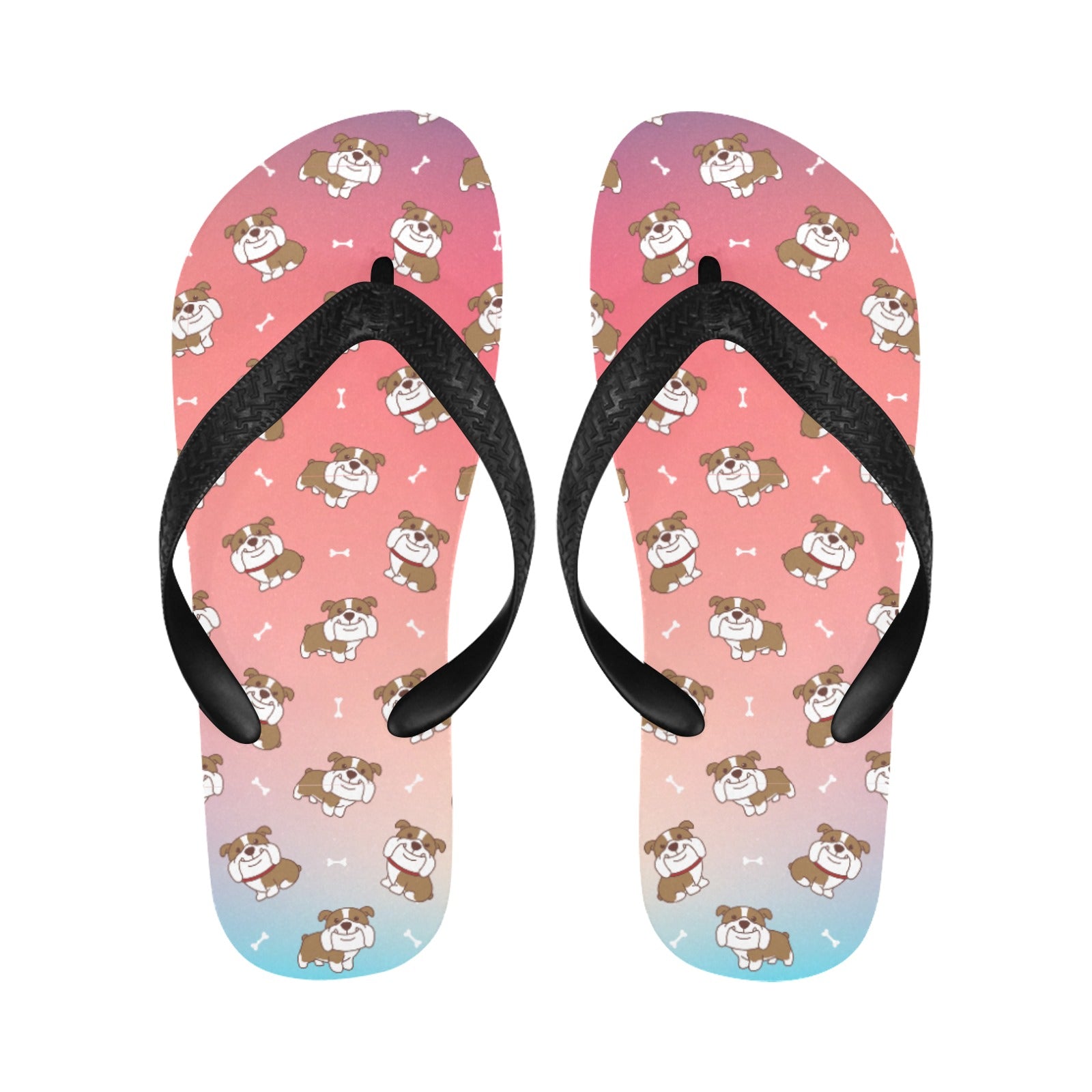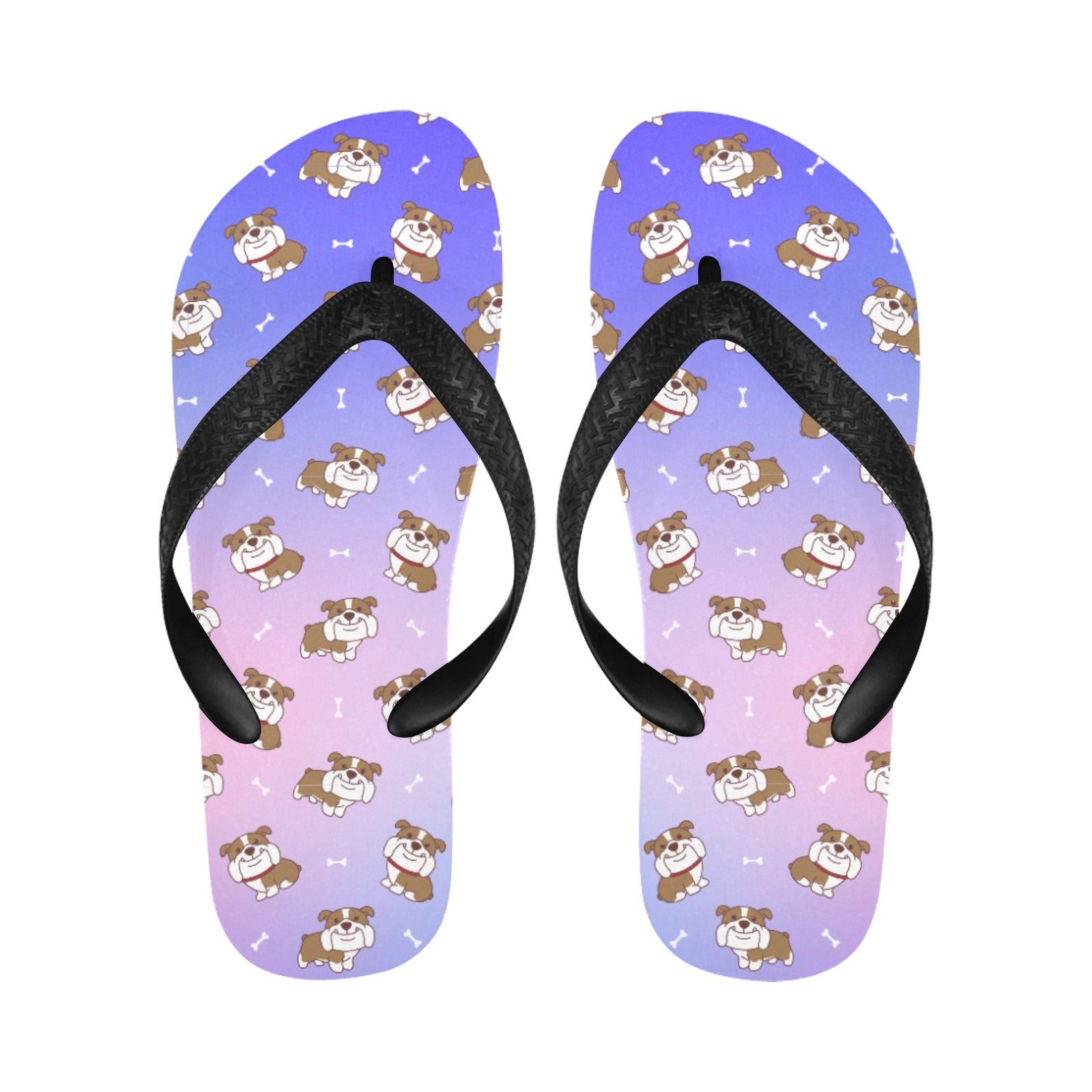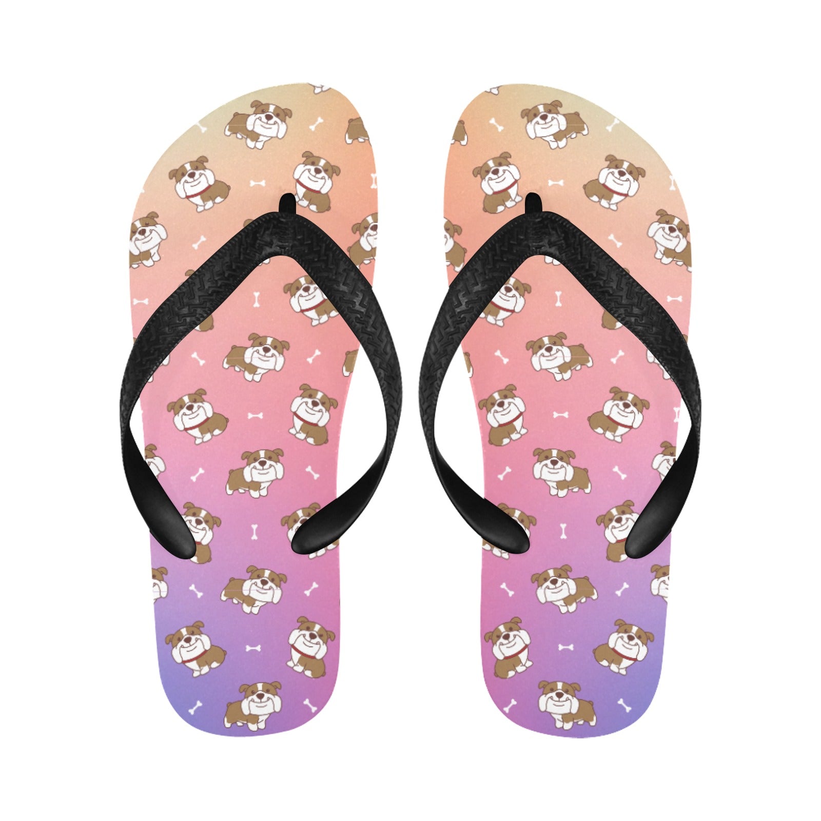 Adorned with playful bone elements, the design creates a balanced and visually appealing composition. Available in seven stunning gradients, including Blush Horizon and Tropical Radiance, these slippers are perfect for any Bulldog lover.