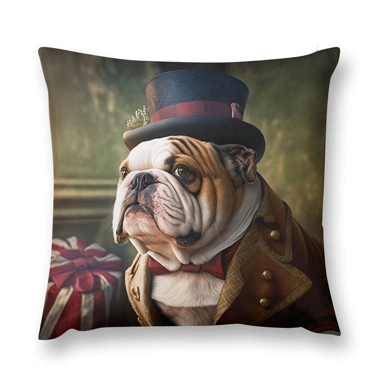 This plush pillow case features a whimsical portrayal of an English Bulldog, a breed renowned for its steadfastness and courage, adorned in a traditional English outfit that harks back to the Victorian era's grandeur.