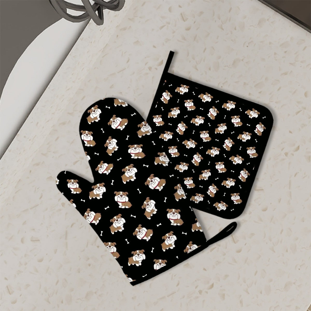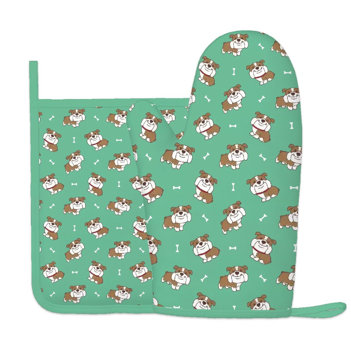Smiling English Bulldog Love Oven Mitts and Pot Holder Set