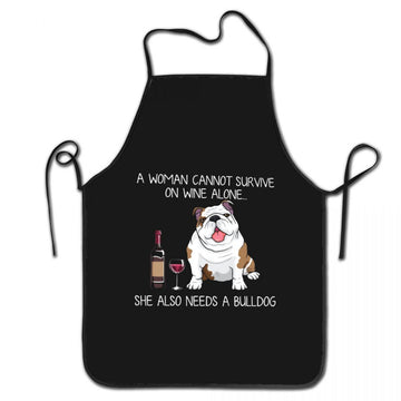 Made with high-quality polyester fabric, that is machine washable, durable, non-fading, and with professionally hemmed edges. Featuring the cutest "A woman cannot survive on wine alone... she also needs a Bulldog" design.