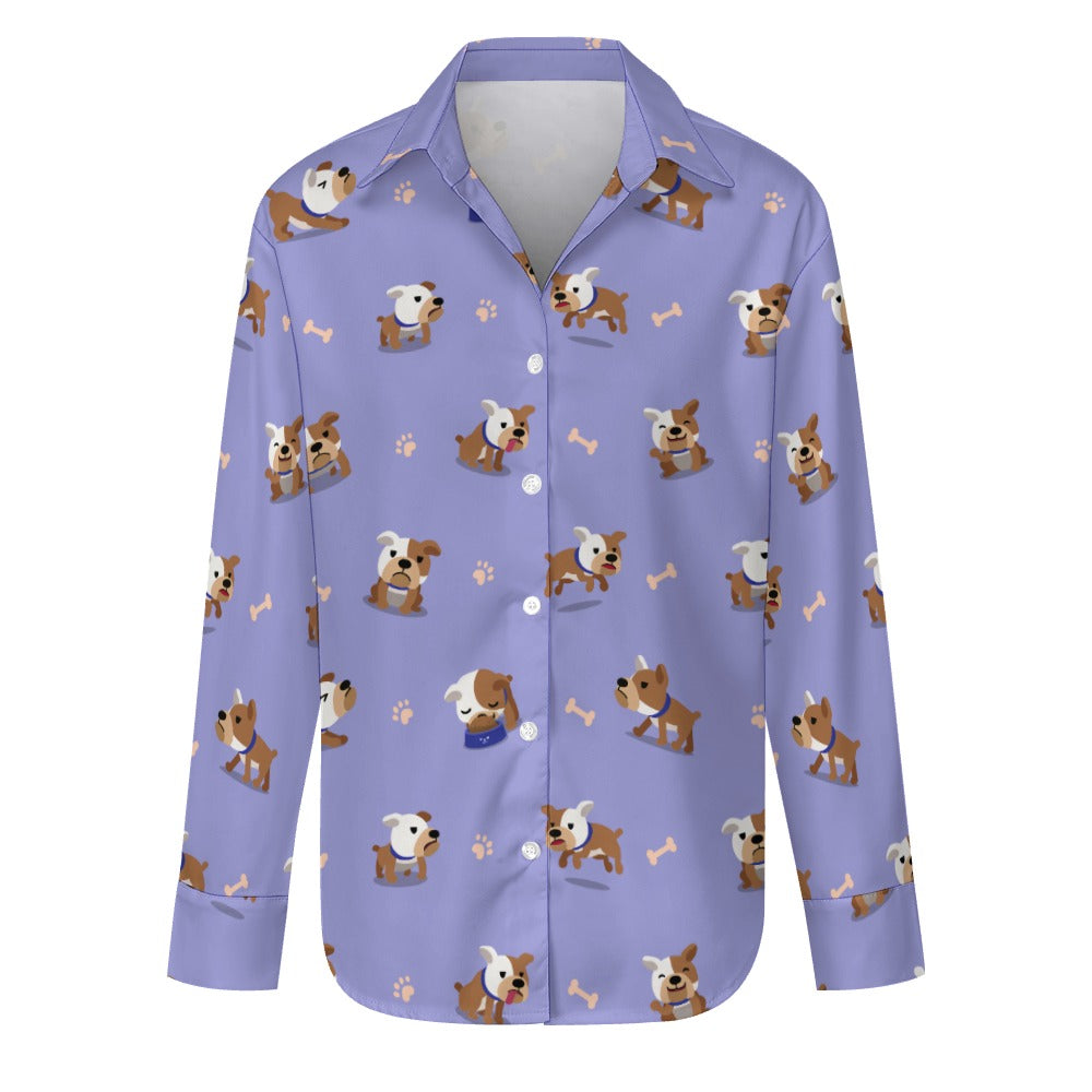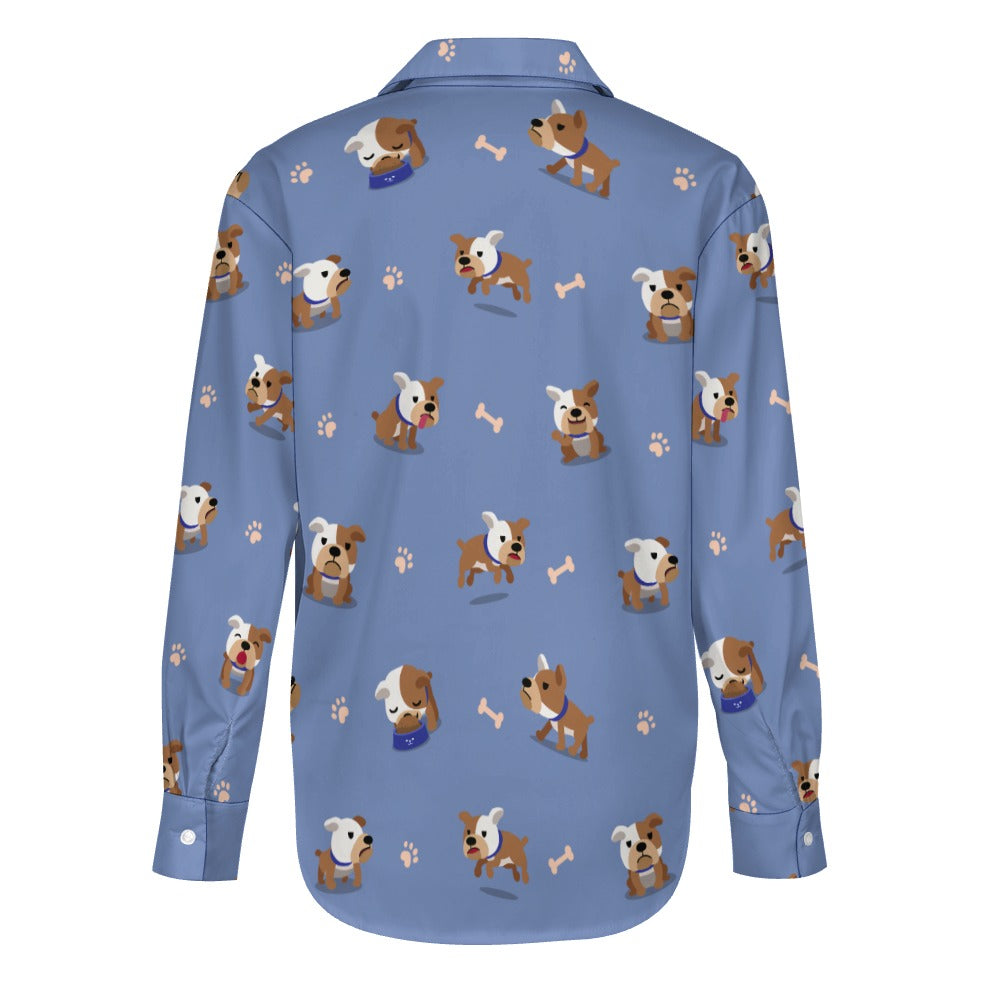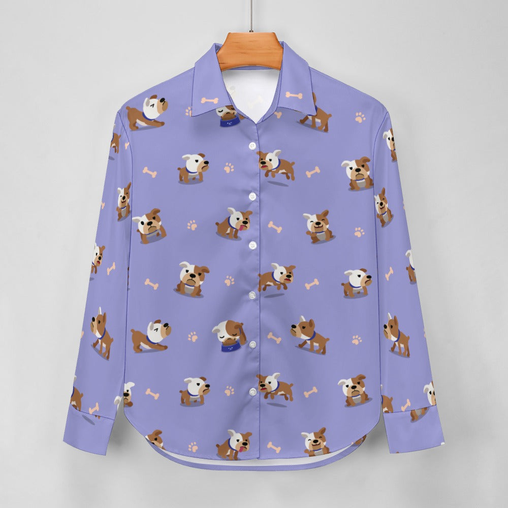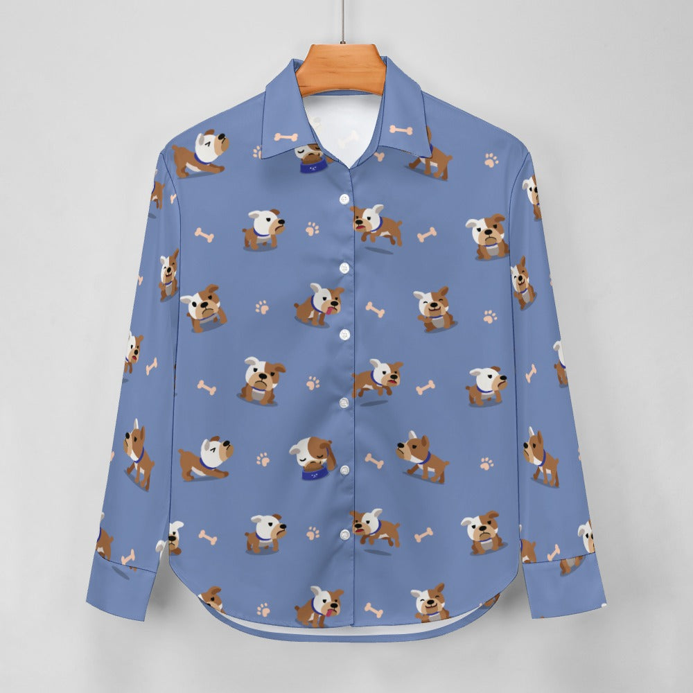 Celebrate your love for English Bulldogs with our Playful English Bulldog Adventures Women's Shirt! This delightful shirt features a charming pattern of cartoon bulldogs, each showcasing their playful spirit in various poses.