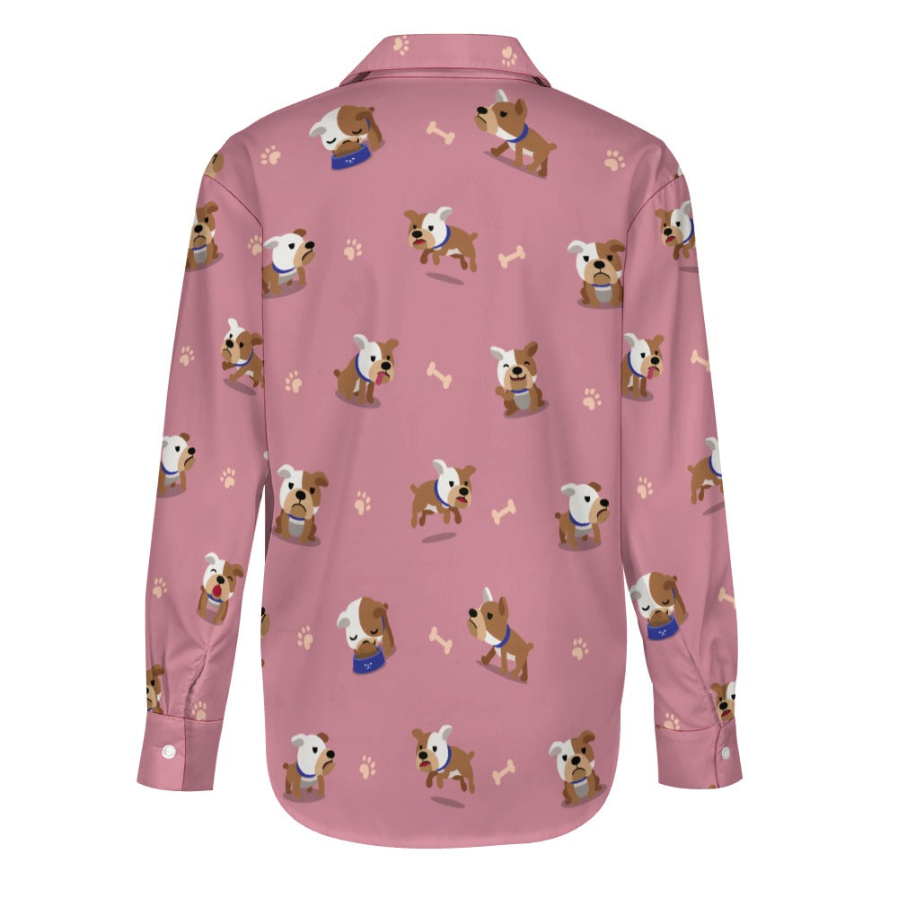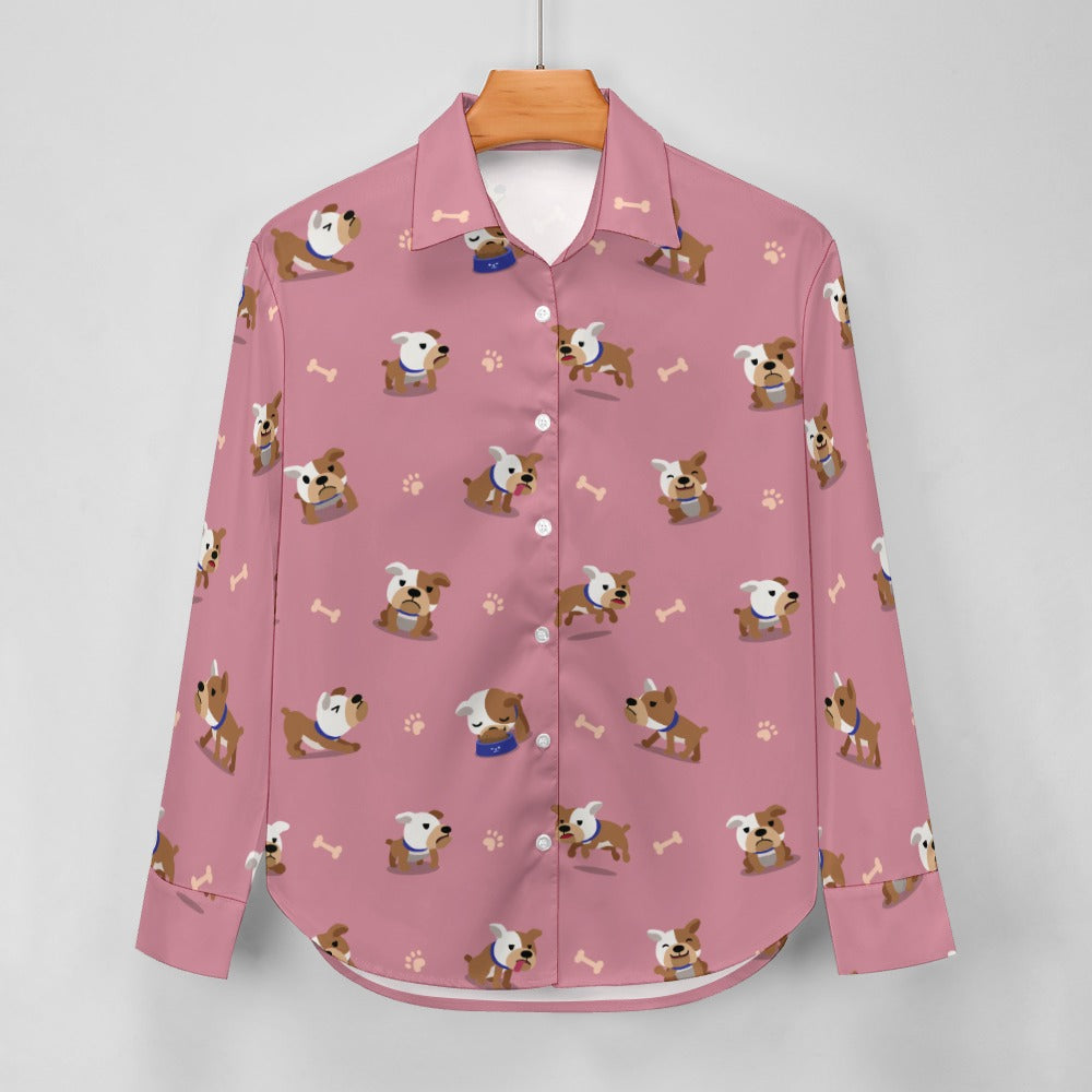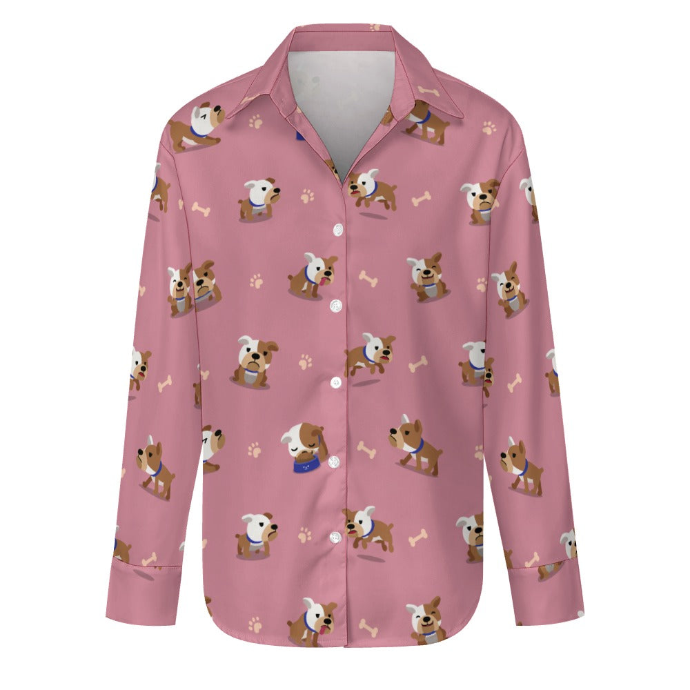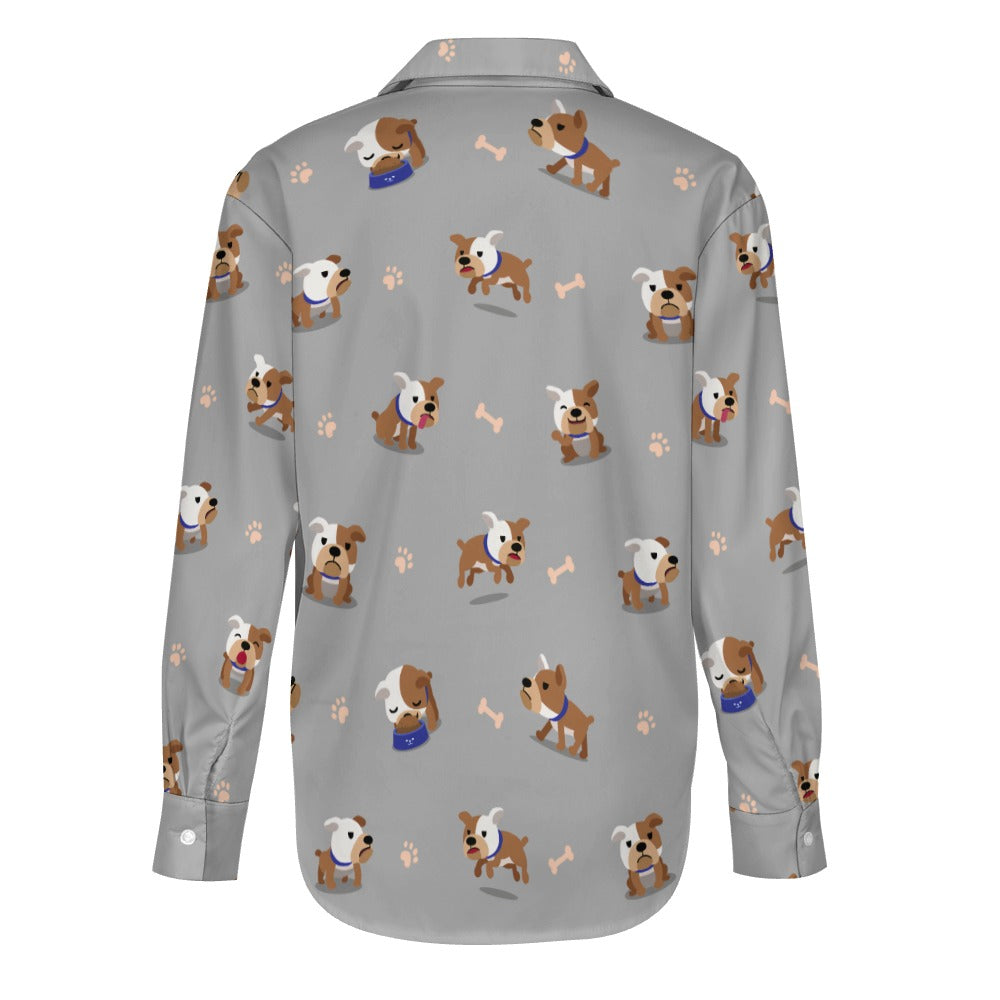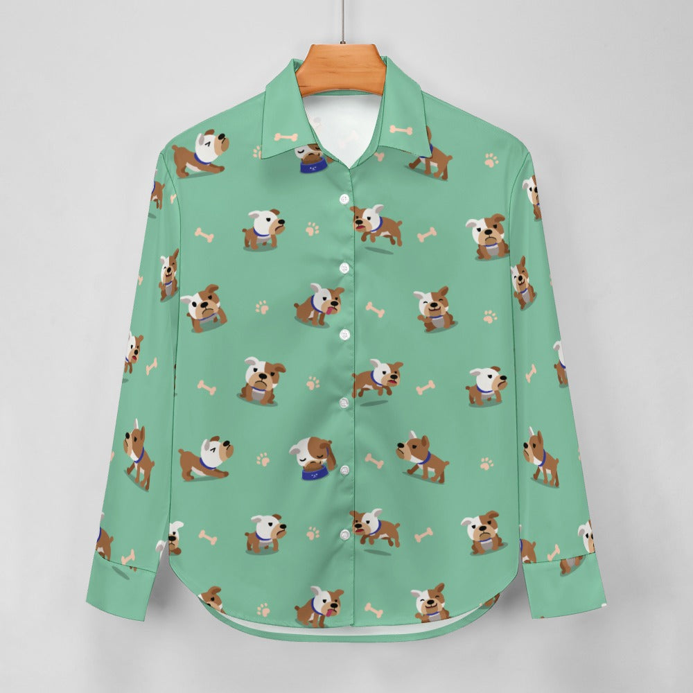 Celebrate your love for English Bulldogs with our Playful English Bulldog Adventures Women's Shirt! This delightful shirt features a charming pattern of cartoon bulldogs, each showcasing their playful spirit in various poses.