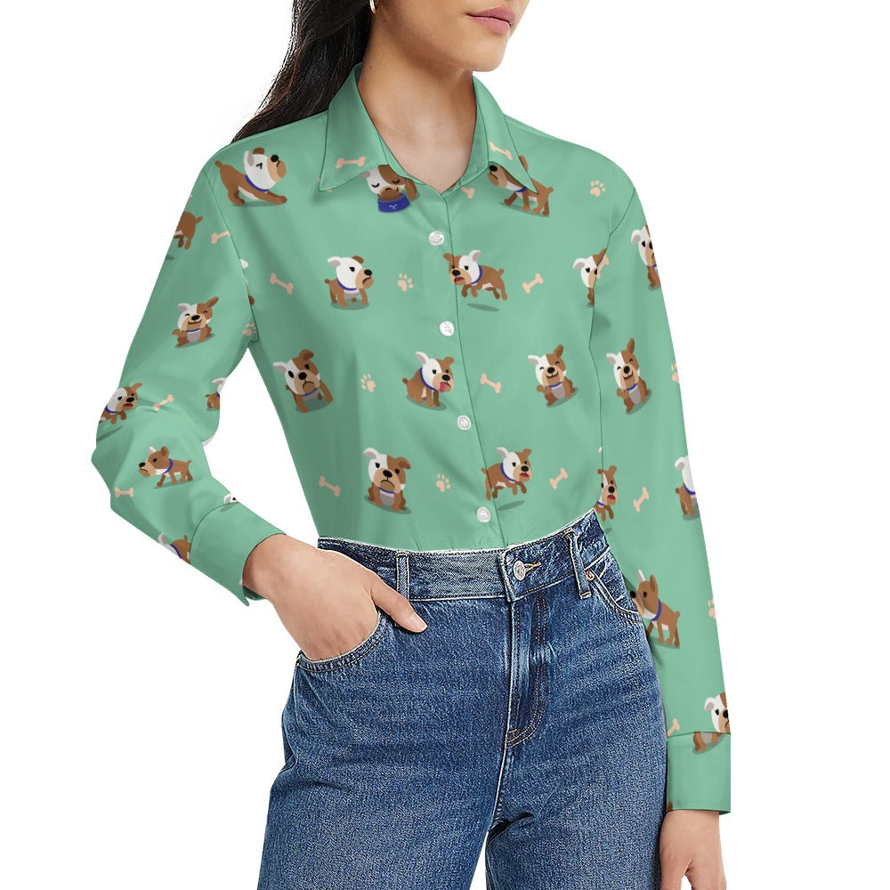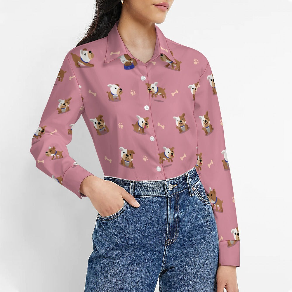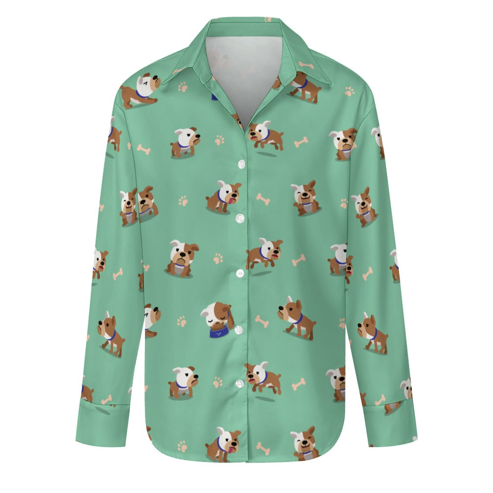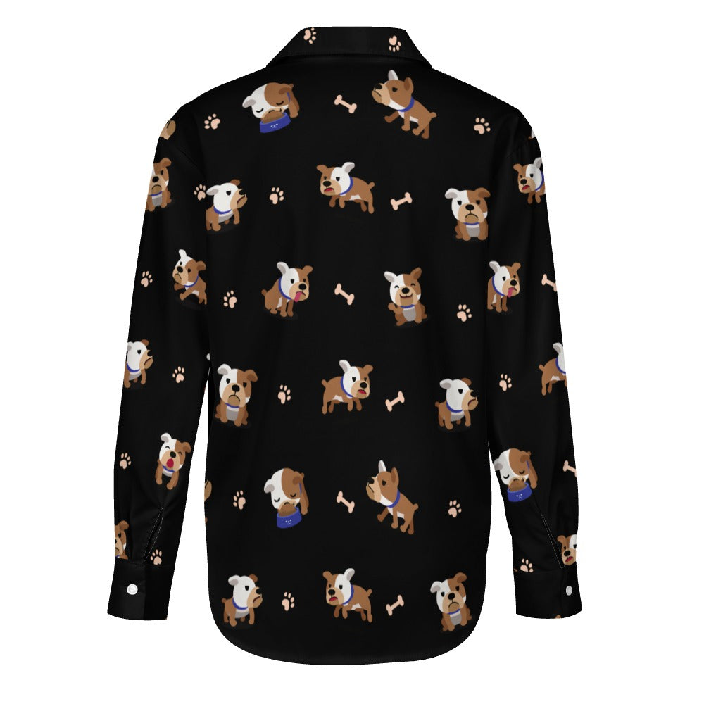 Celebrate your love for English Bulldogs with our Playful English Bulldog Adventures Women's Shirt! This delightful shirt features a charming pattern of cartoon bulldogs, each showcasing their playful spirit in various poses.