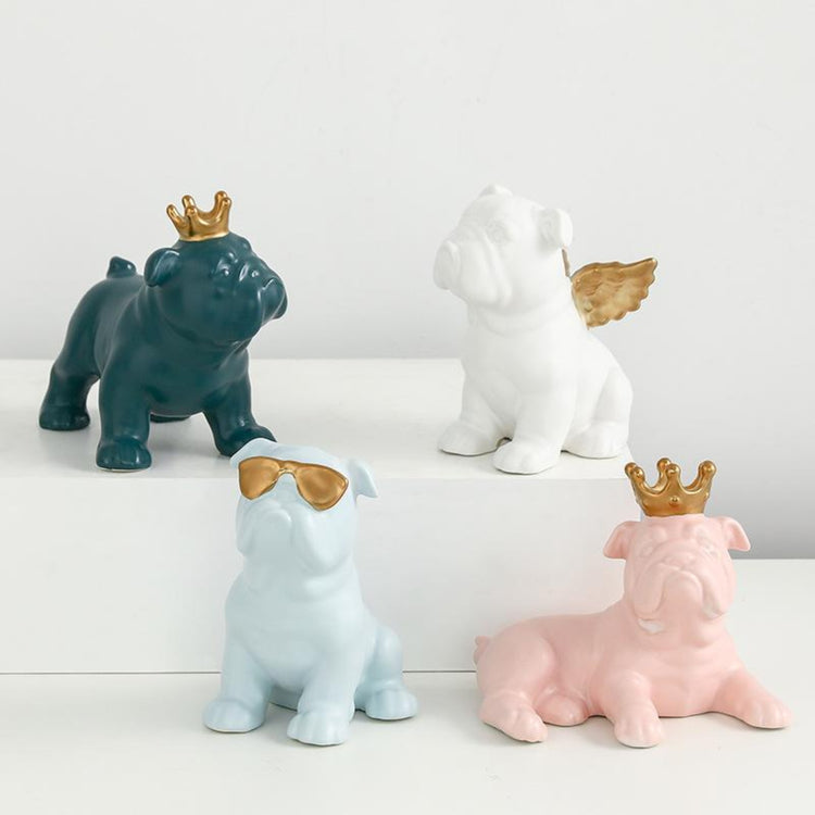Image of four english bulldog statues made of ceramic in the color pink, light blue, teal, and white