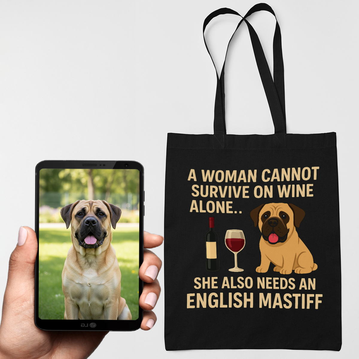 Celebrate the unbreakable bond between you and your English Mastiff with our Personalized “A Woman Cannot Survive on Wine…” Custom Tote Bags! This unique accessory transforms your beloved dog into a work of art, making it a heartfelt addition to any dog lover's collection.