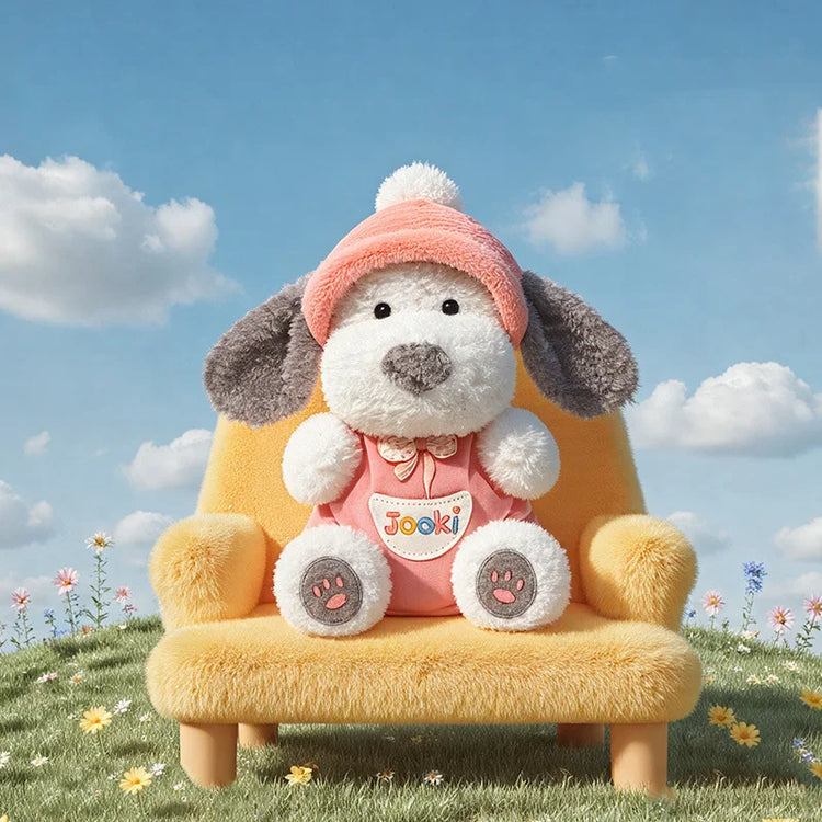 This adorable plush is perfect for anyone who cherishes the love of their furry friends. Its charming pink romper and pom-pom beanie add a delightful touch, making it a perfect companion for kids.