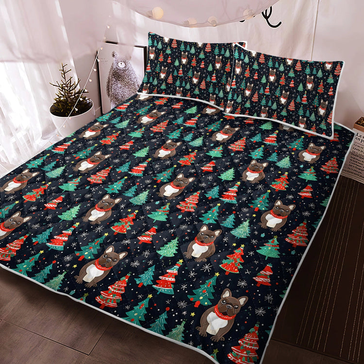 This Black / Brindle French Bulldog Festive Frolic Christmas Quilt Blanket Bedding Set captures the essence of Christmas. The design features French Bulldogs with jolly Santa beards against a starry night sky, surrounded by whimsical Christmas trees.