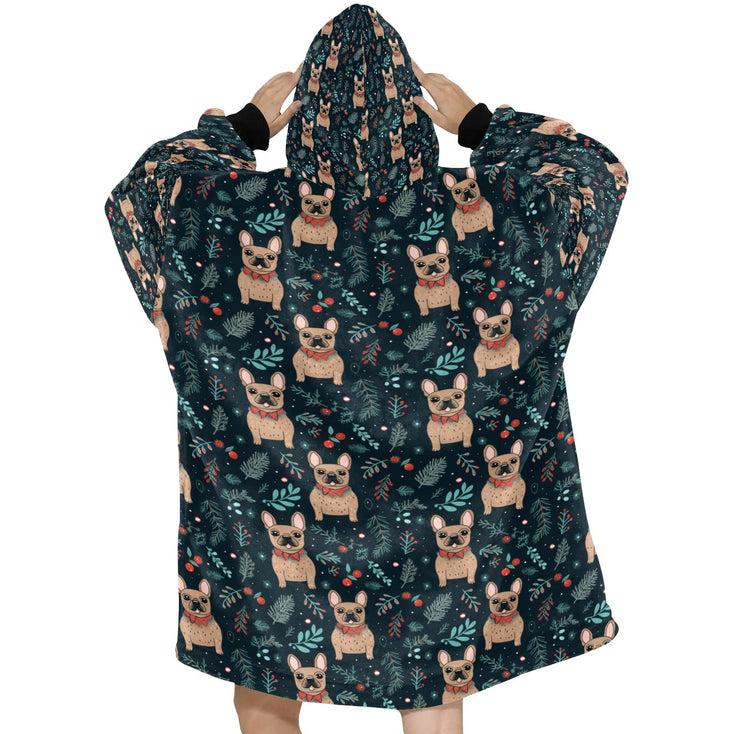 Festive Fawn French Bulldog Forest Christmas Blanket Hoodie-Blanket-Apparel, Blanket Hoodie, Blankets, Christmas, Dog Mom Gifts, French Bulldog-ONE SIZE-1