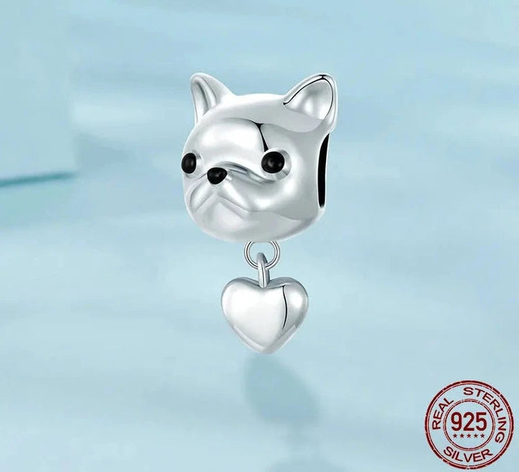 Celebrate your love for French Bulldogs with our exquisite Dangling Heart French Bulldog Silver Charm.