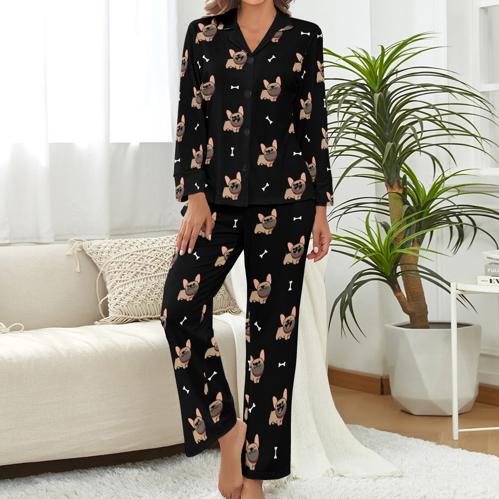 Fawn Frenchie Love Pajamas Set for Women-Midnight Black-XS-35