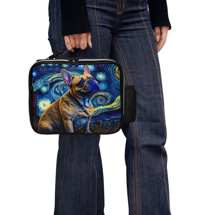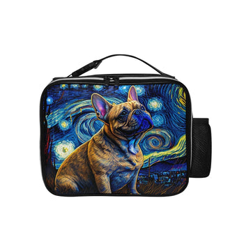 Inspired by the masterpiece "The Starry Night" by Van Gogh, this lunch bag features a French Bulldog against a dramatic backdrop of swirling celestial patterns.