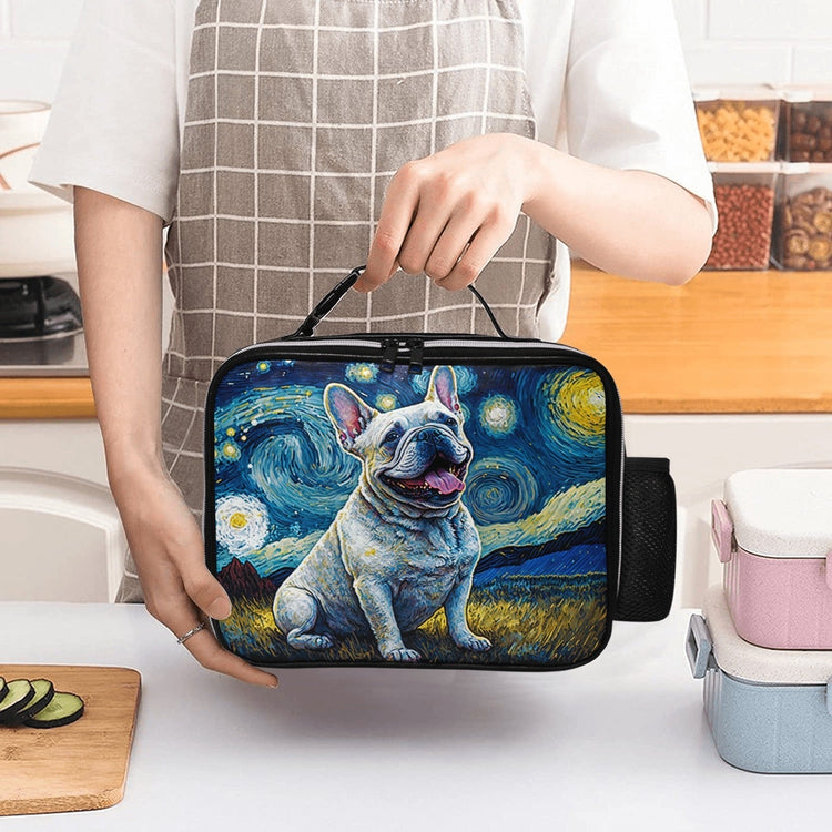 Featuring a joyous white French Bulldog against the dreamlike backdrop of Vincent van Gogh's "Starry Night," this lunch bag is a testament to the beauty of art and the endearing qualities of the French Bulldog breed.