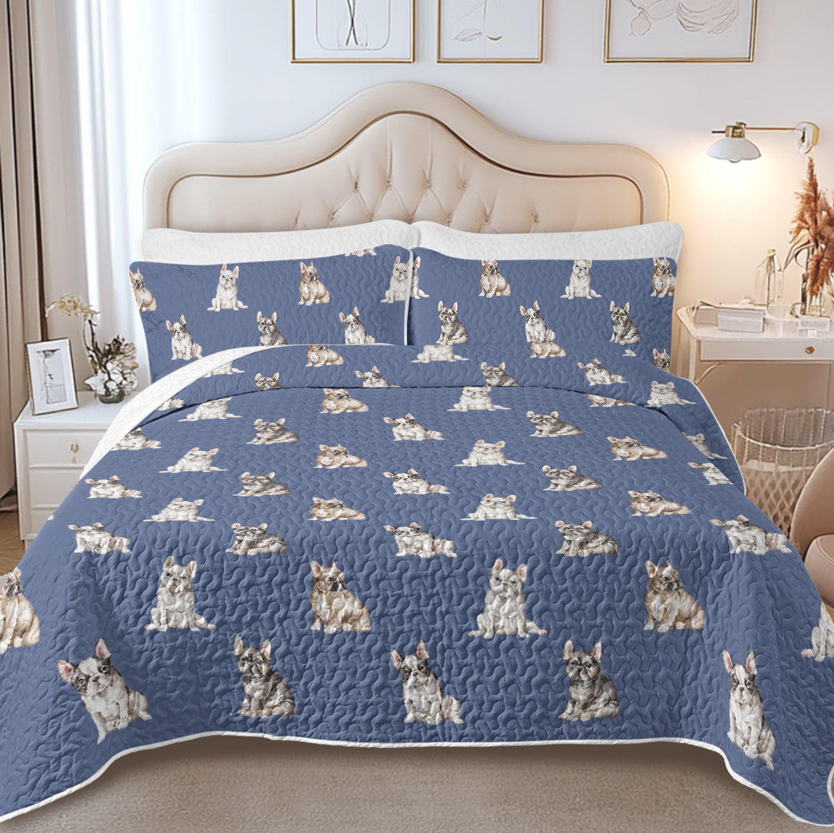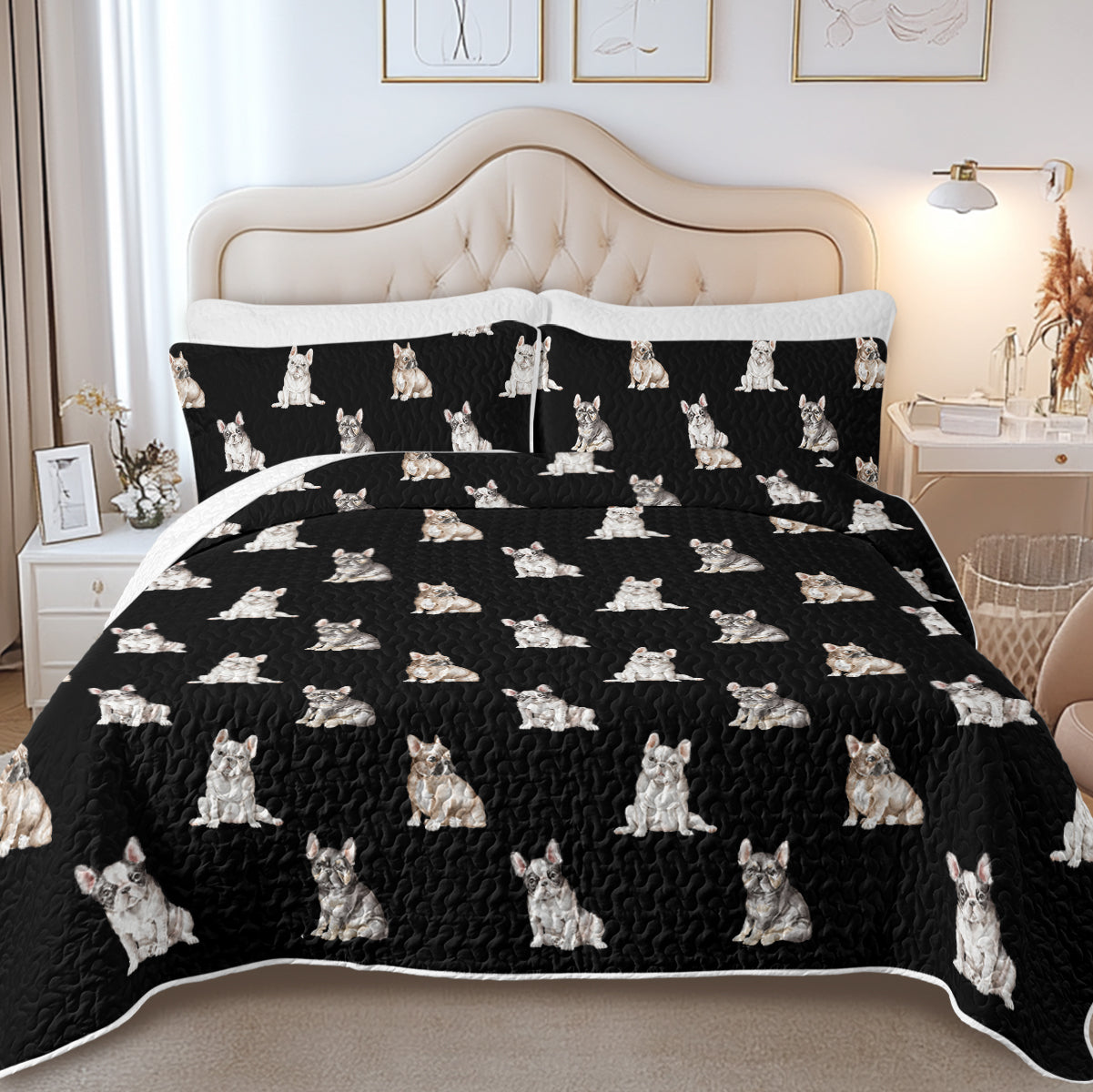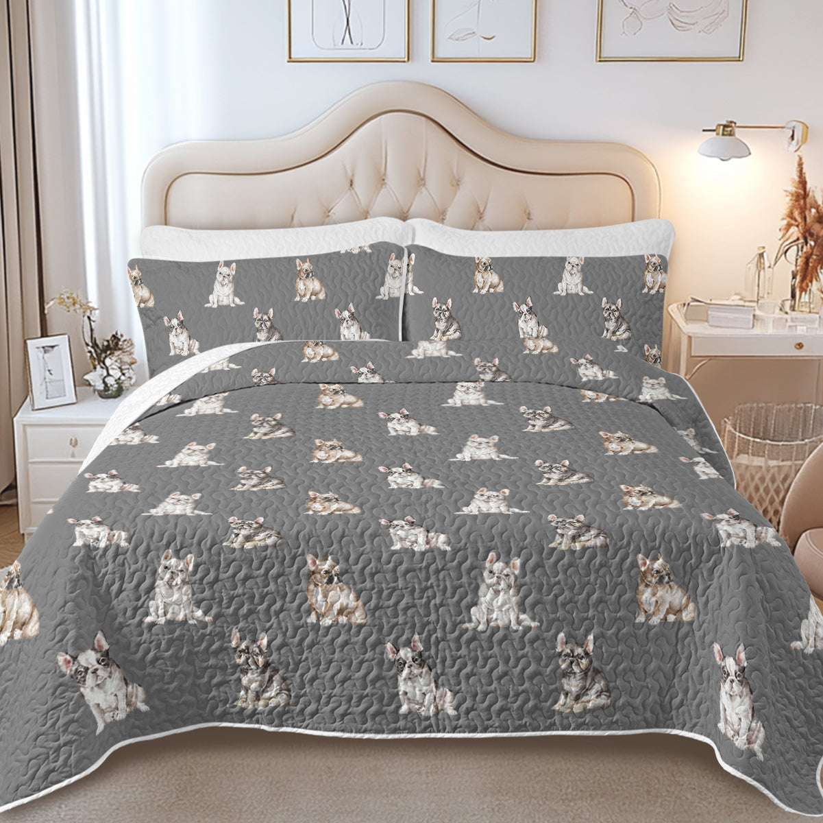 Wrap yourself in the charm of French Bulldog Puppies with our exquisite quilted bedding set.