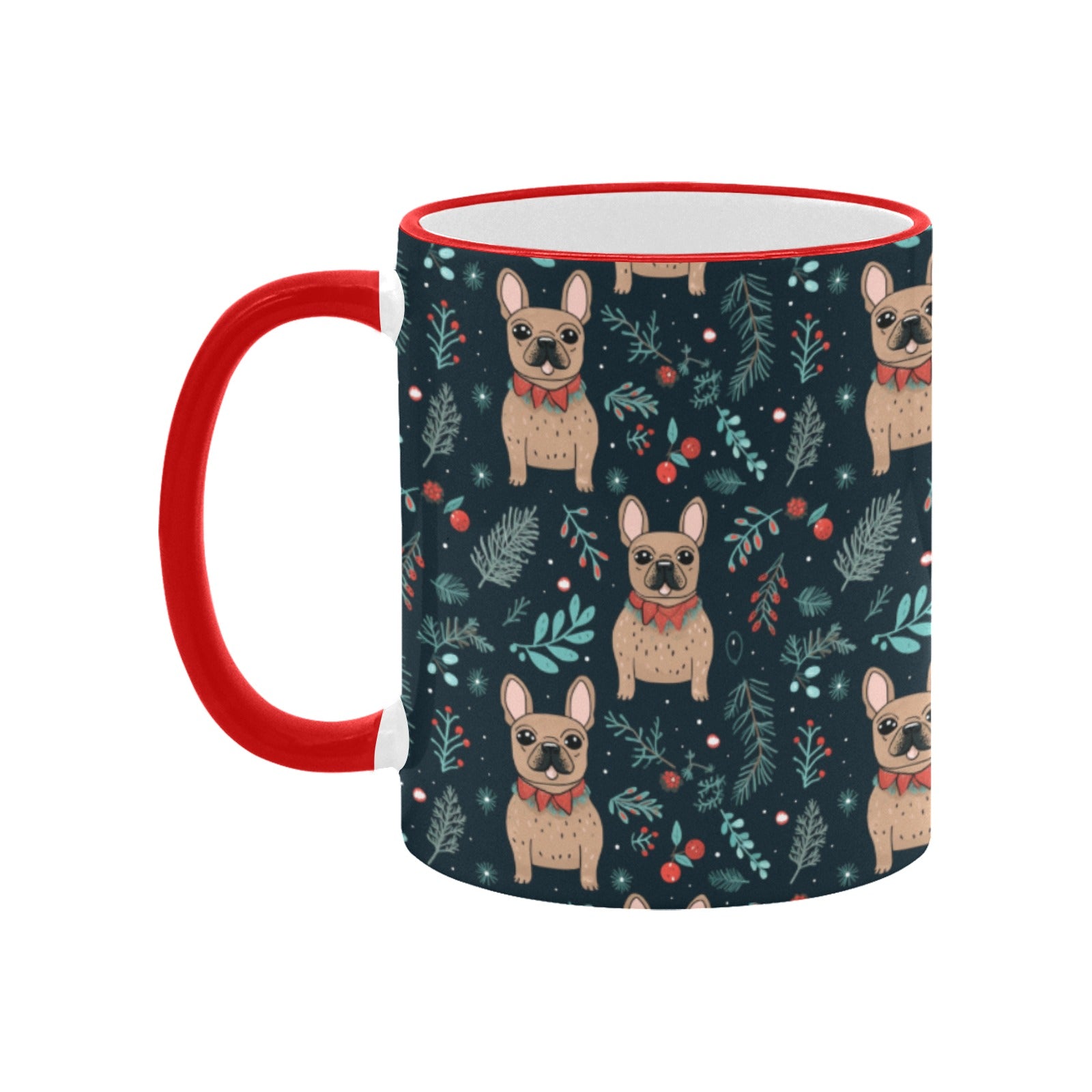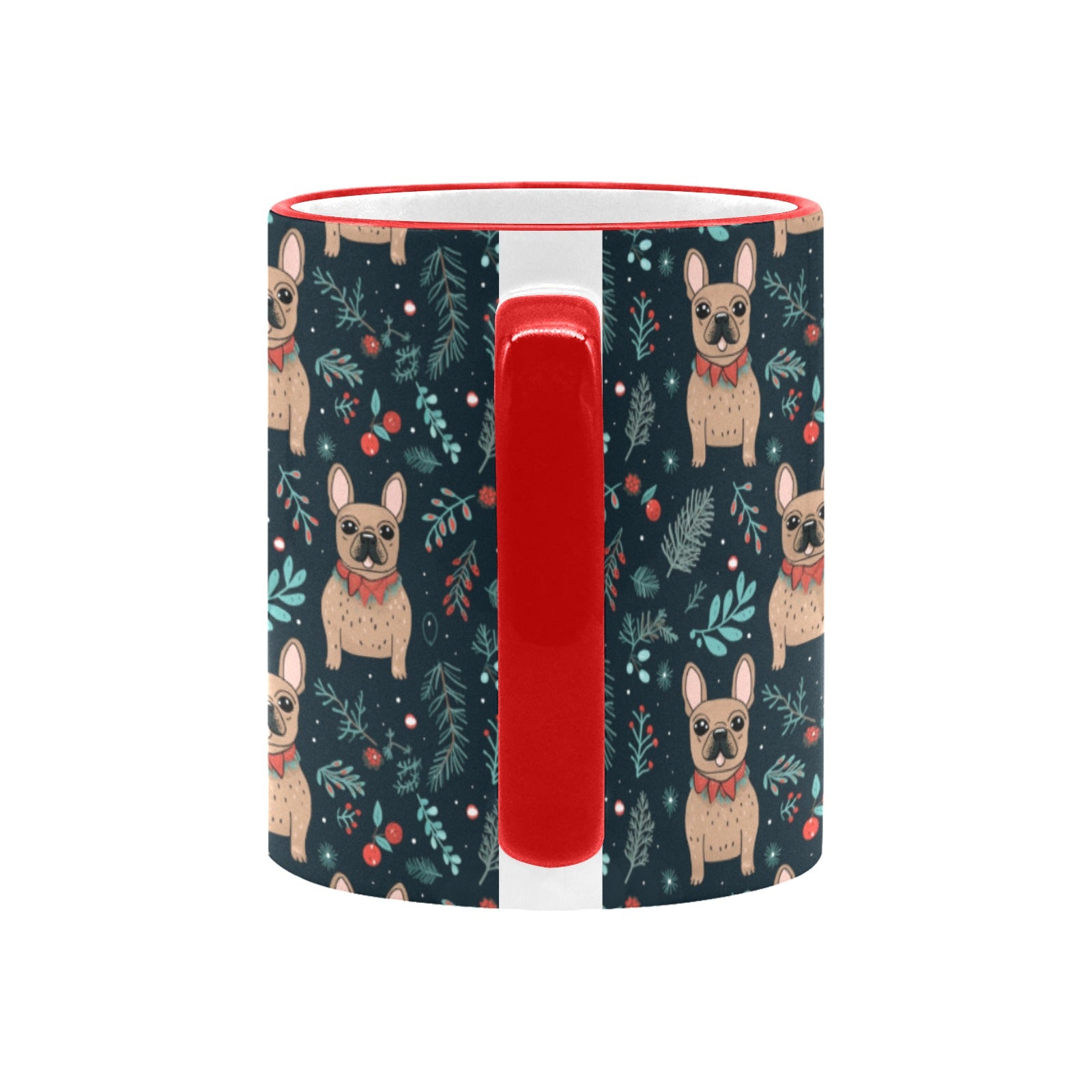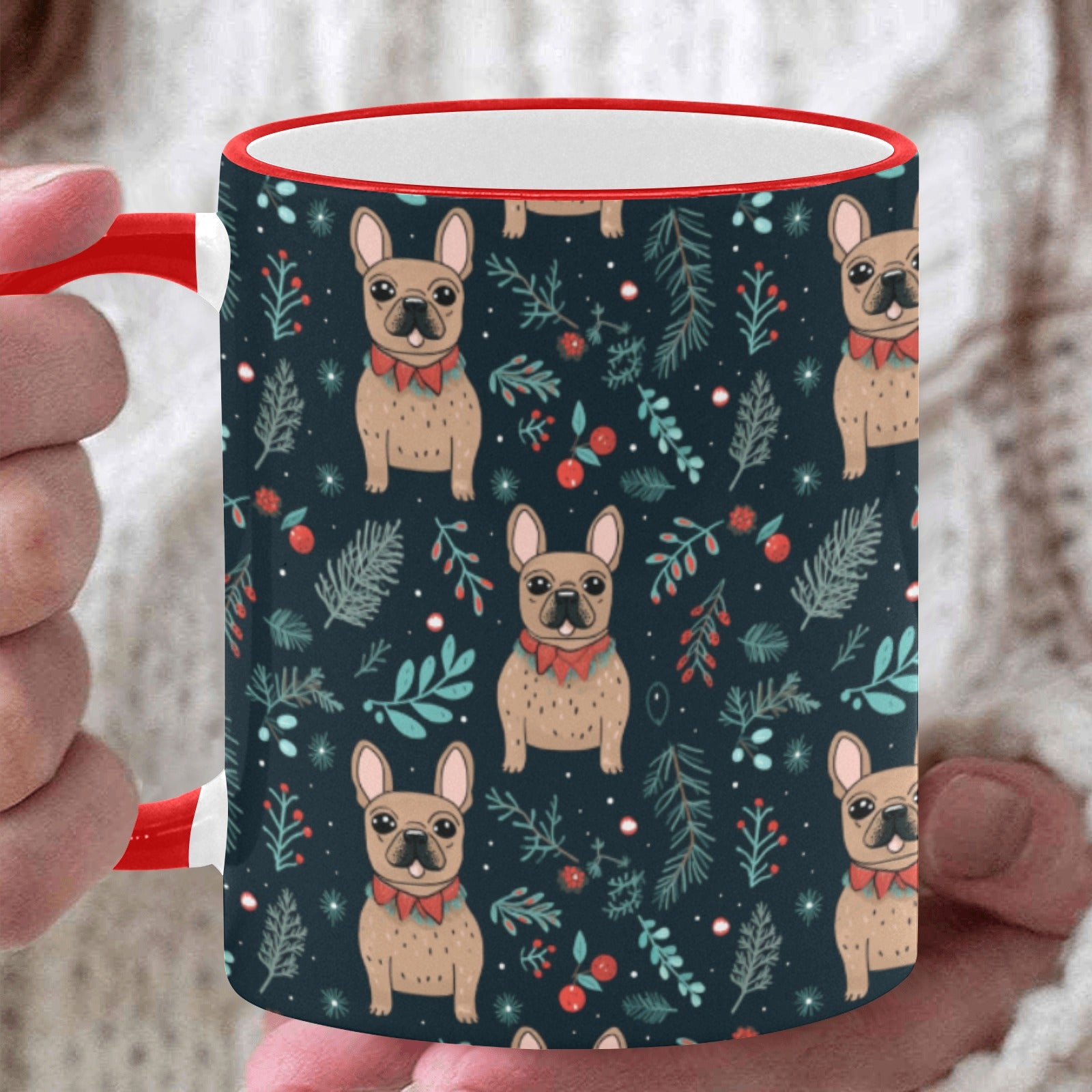 This delightful mug features a charming design of playful French Bulldogs frolicking amidst a wintery botanical backdrop, perfect for dog lovers and festive spirits alike.