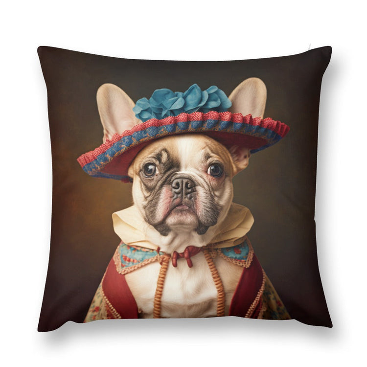This unique pillow case features a fawn French Bulldog, a breed loved for its friendly nature and distinctive bat-like ears, all dressed up in an outfit that pays homage to the grandeur of traditional French fashion.