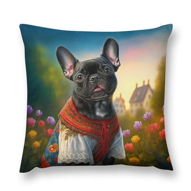 This plush pillow case captures the essence of a bygone era, featuring a noble French Bulldog adorned in traditional folk attire. With its distinctive bat-like ears standing alert, this affable breed becomes a whimsical emissary of the past, wrapped in a garment blooming with vibrant floral motifs.