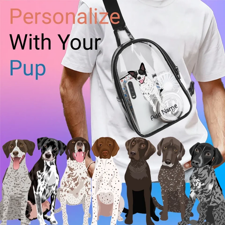 Introducing the Personalized German Shorthair Pointer Unisex Transparent Sling Bag. This stylish accessory captures the likeness of your beloved pup, complete with true-to-breed coat color options. Flaunt your German Shorthair Pointer loving personality with this unique, customizable bag.