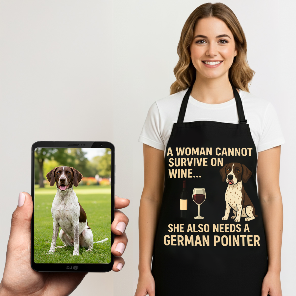 Celebrate your love for your furry friend with our Personalized “A Woman Cannot Survive on Wine Alone… She Also Needs a German Pointer” Custom Dog Apron. This unique apron is perfect for dog lovers who enjoy cooking or entertaining while showcasing their bond with their beloved breed.