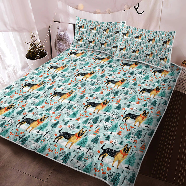 Celebrate the holidays with the German Shepherd's Holiday Forest Frolic Christmas Quilt Blanket Bedding Set!