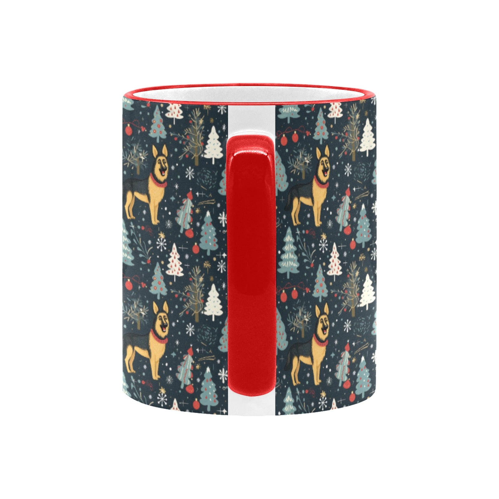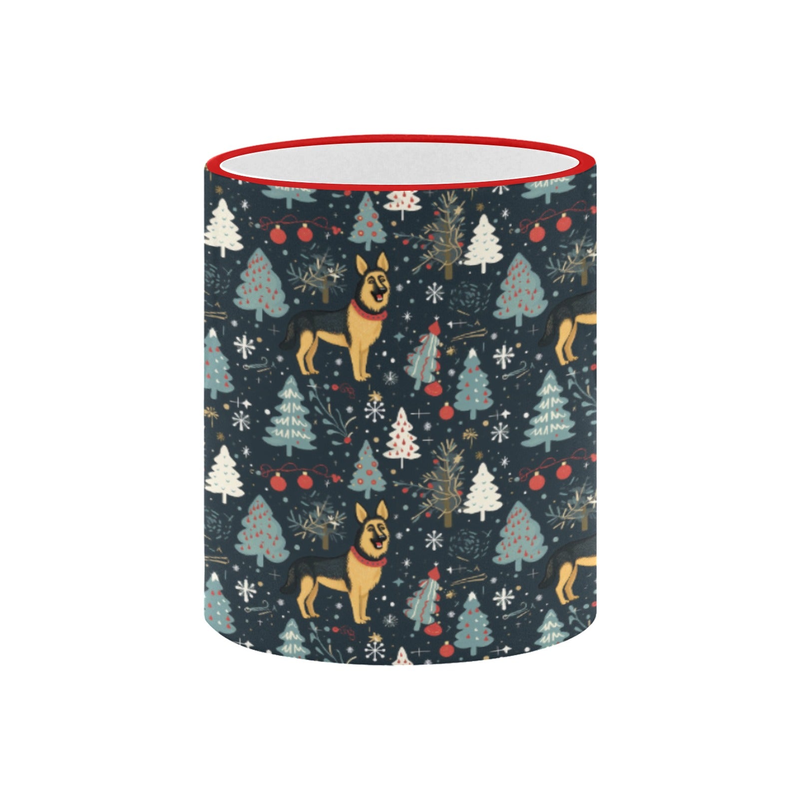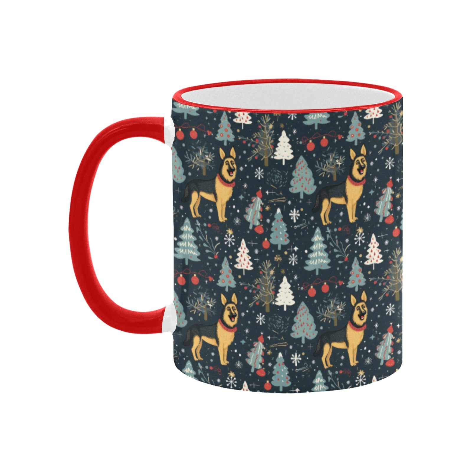 This delightful mug features a charming winter landscape that brings the iconic German Shepherd into a vibrant Christmas setting.