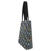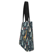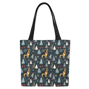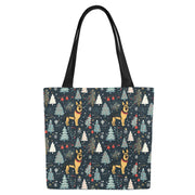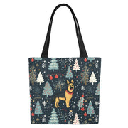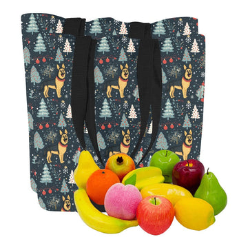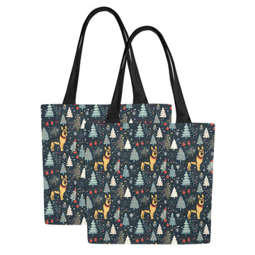 These tote bags capture the essence of the holiday season, bringing the noble German Shepherd into a whimsical winter landscape. The designs feature these loyal dogs amidst a backdrop of Christmas trees and seasonal decorations, set against a dark navy blue sky.