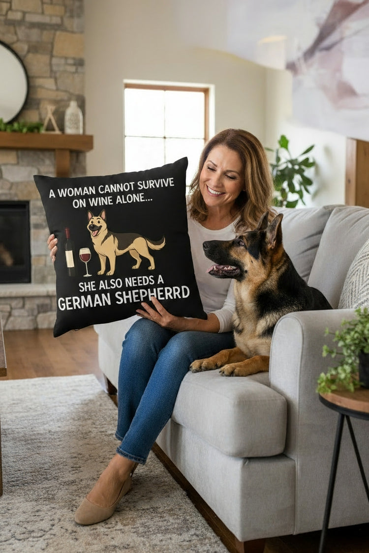 Personalized “A Woman Cannot Survive on Wine Alone…” German Shepherd Pillowcase