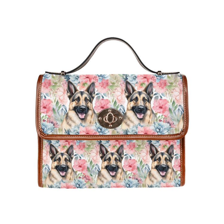 Embrace the fusion of natural elegance and canine grace with our Watercolor Flower Garden German Shepherd Satchel Bag Purse.