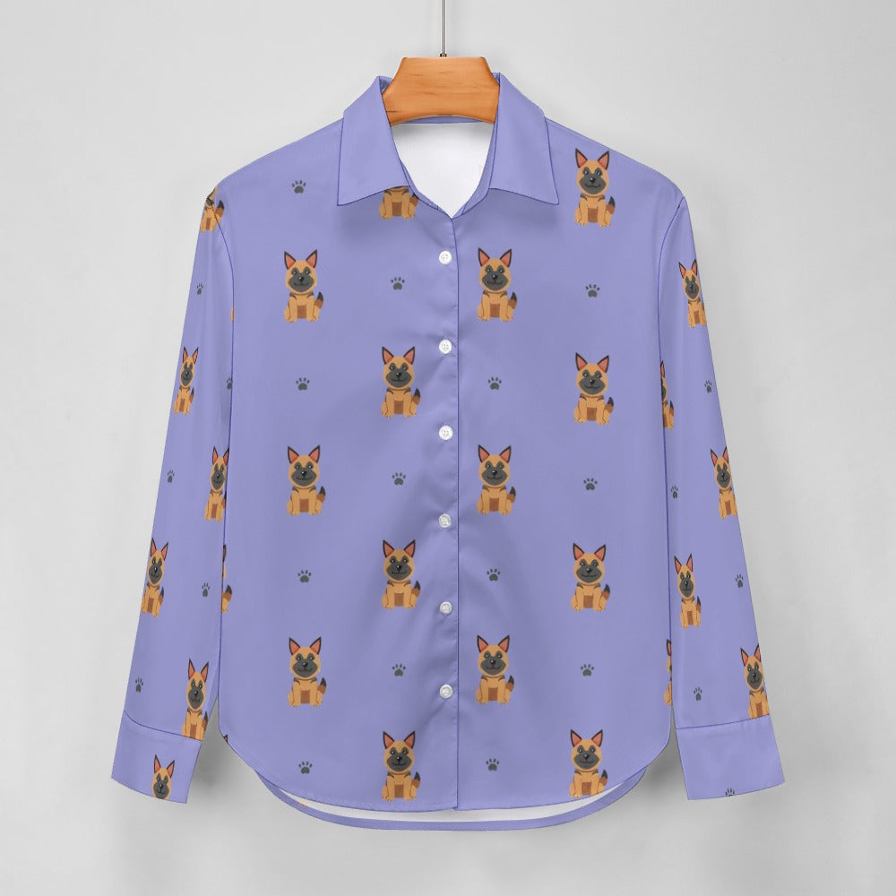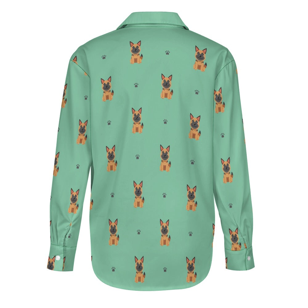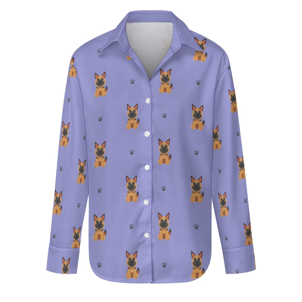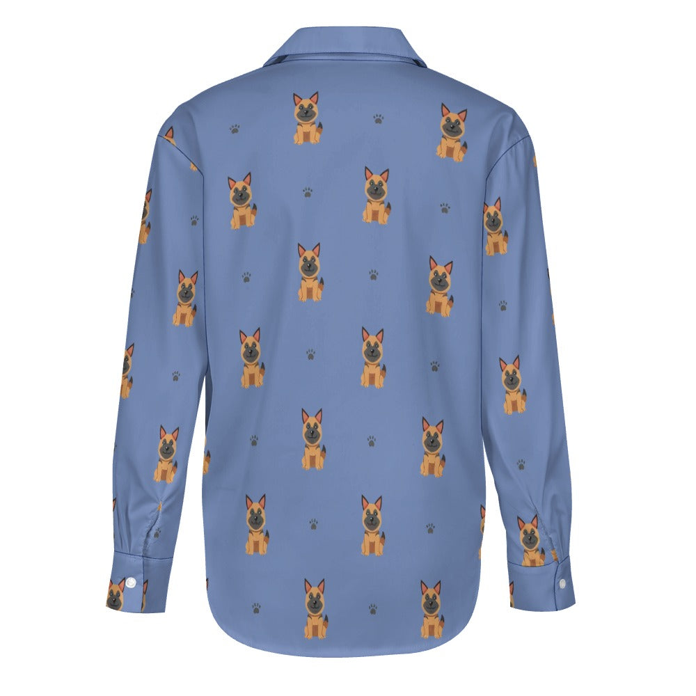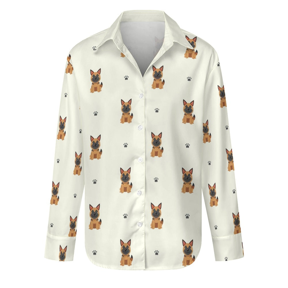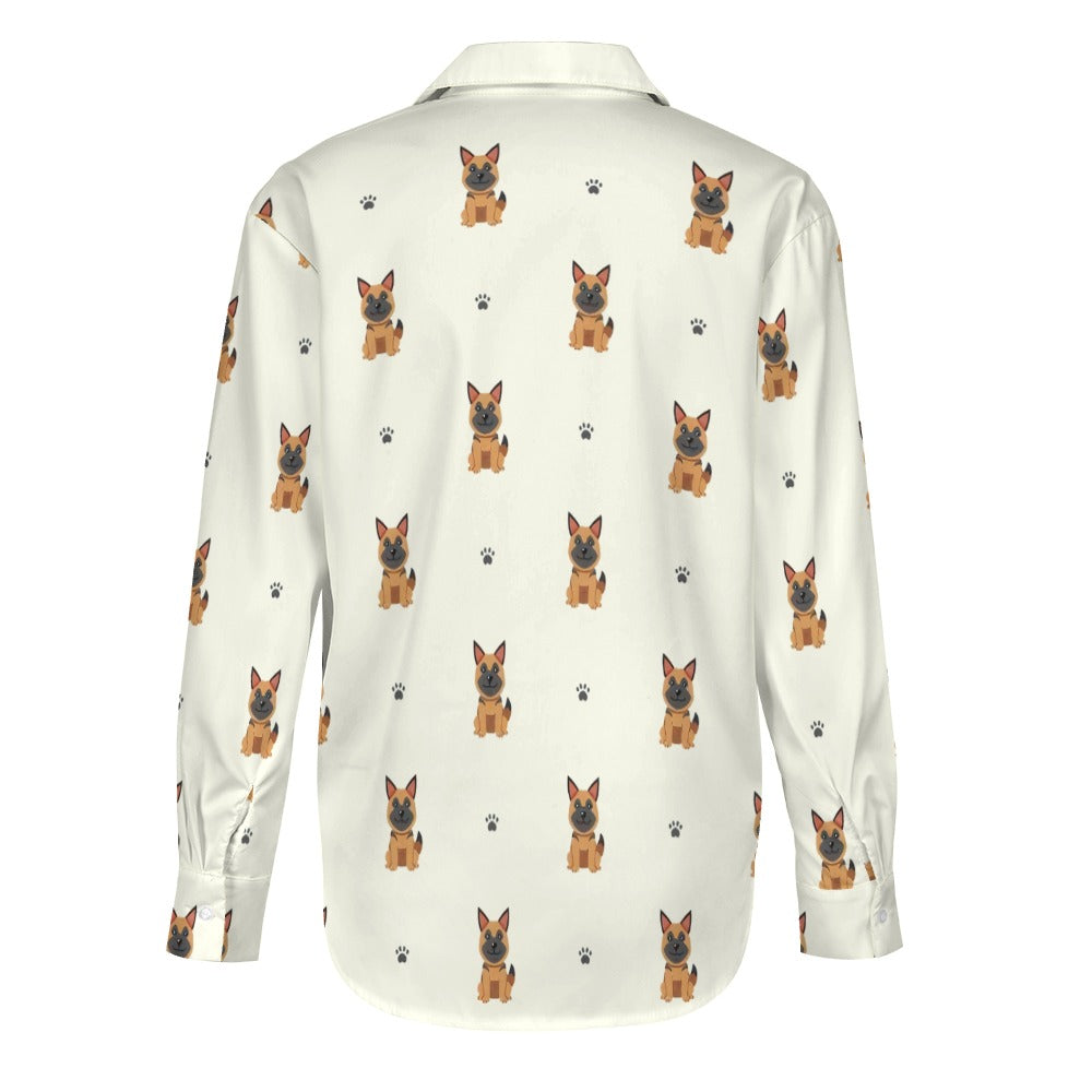 Celebrate your love for German Shepherds with our adorable Loyal German Shepherd Pup Women's Shirt! This charming design features a playful pattern of cartoon German Shepherds, each exuding confidence and warmth.
