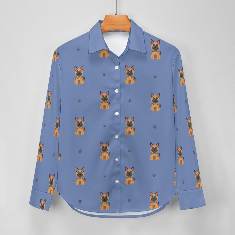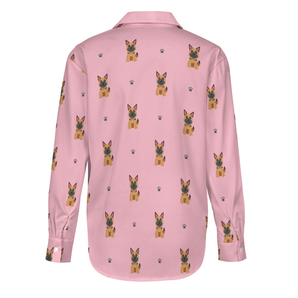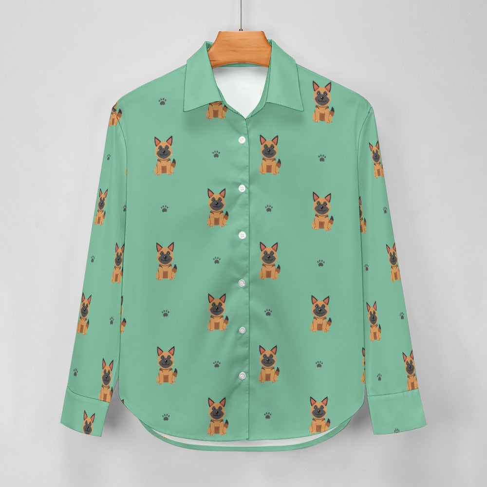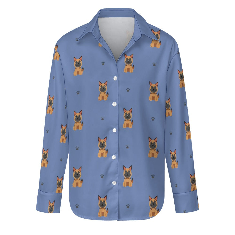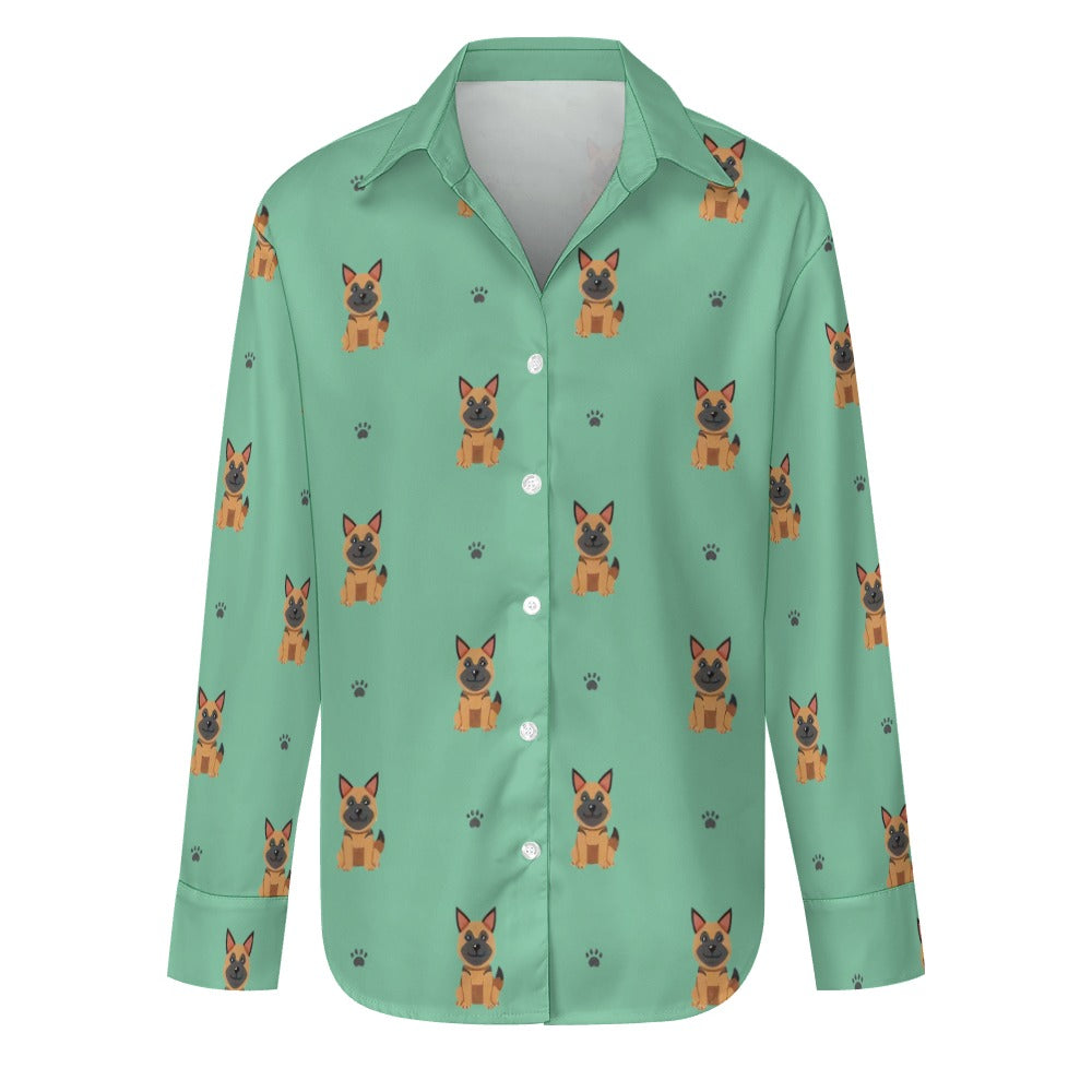 Celebrate your love for German Shepherds with our adorable Loyal German Shepherd Pup Women's Shirt! This charming design features a playful pattern of cartoon German Shepherds, each exuding confidence and warmth.