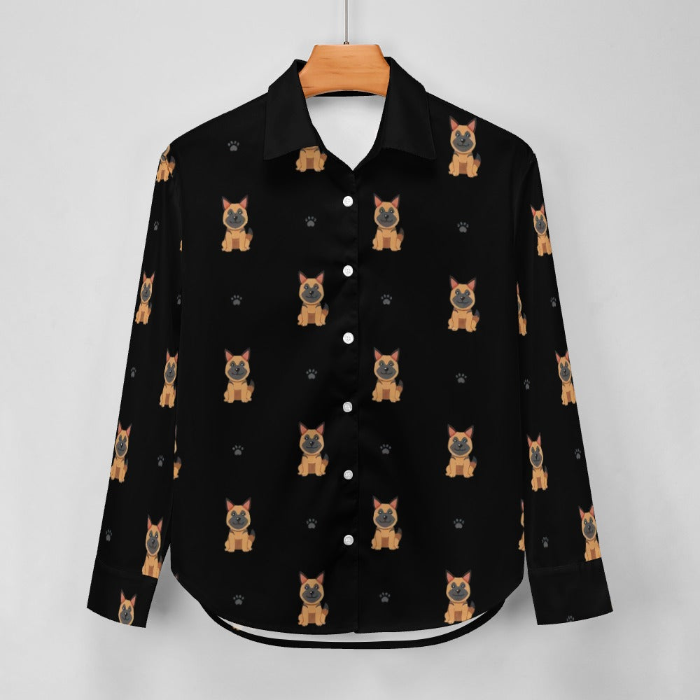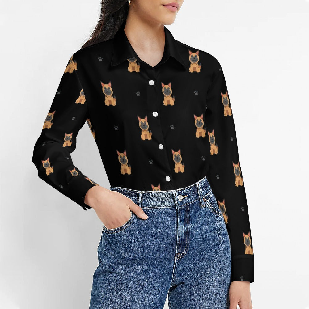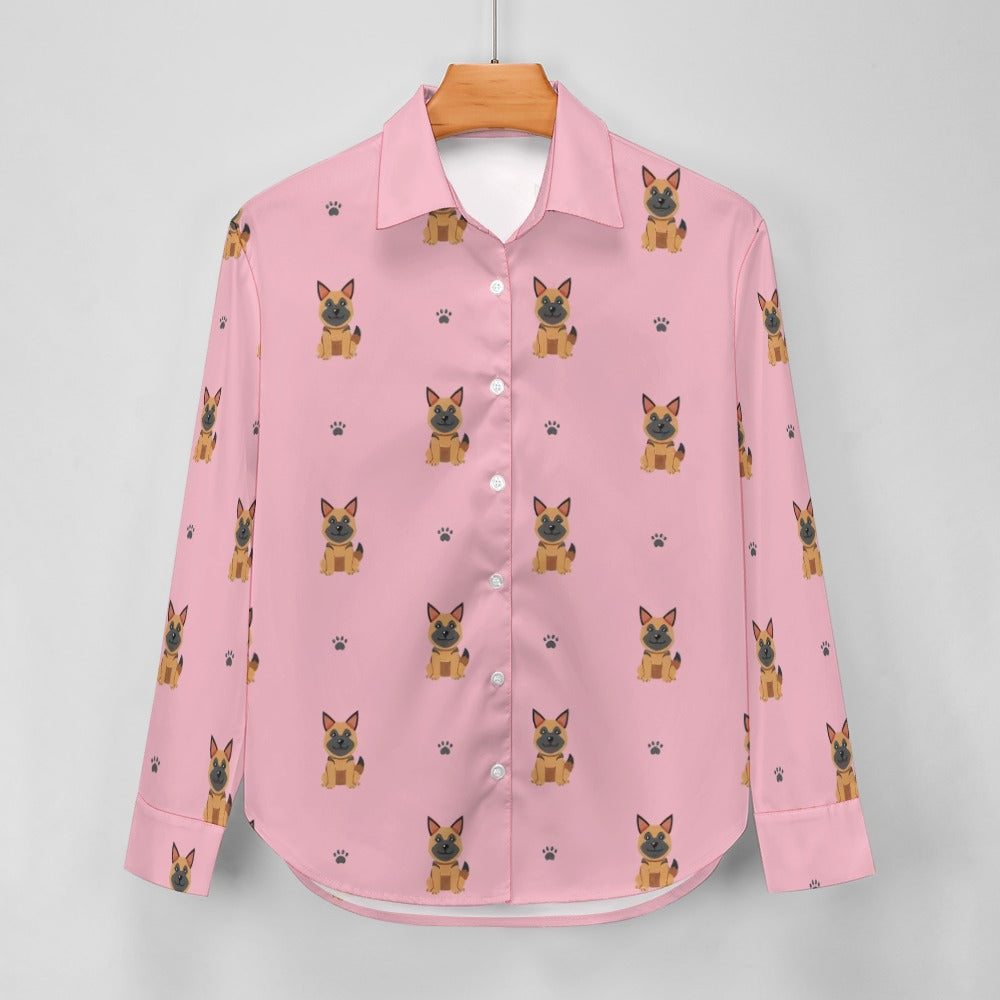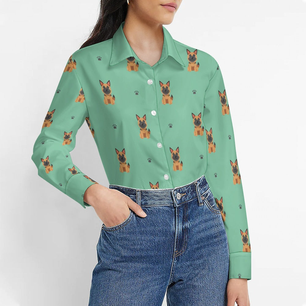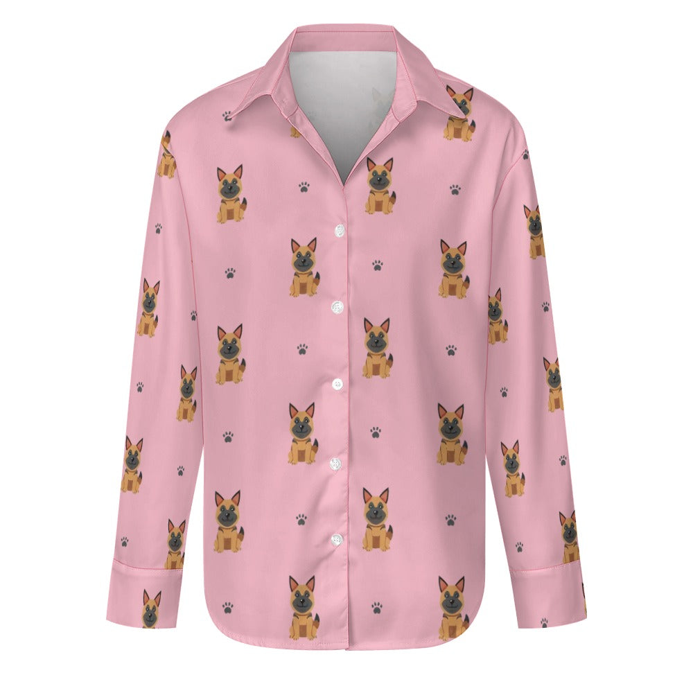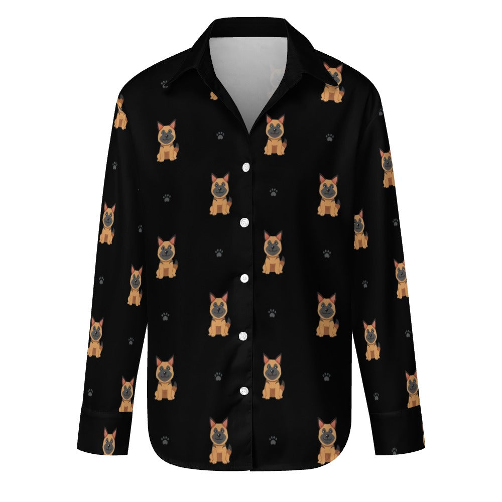 Celebrate your love for German Shepherds with our adorable Loyal German Shepherd Pup Women's Shirt! This charming design features a playful pattern of cartoon German Shepherds, each exuding confidence and warmth.