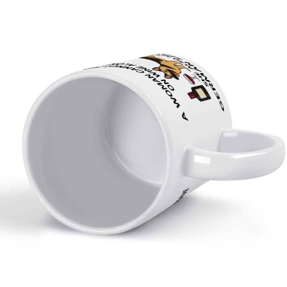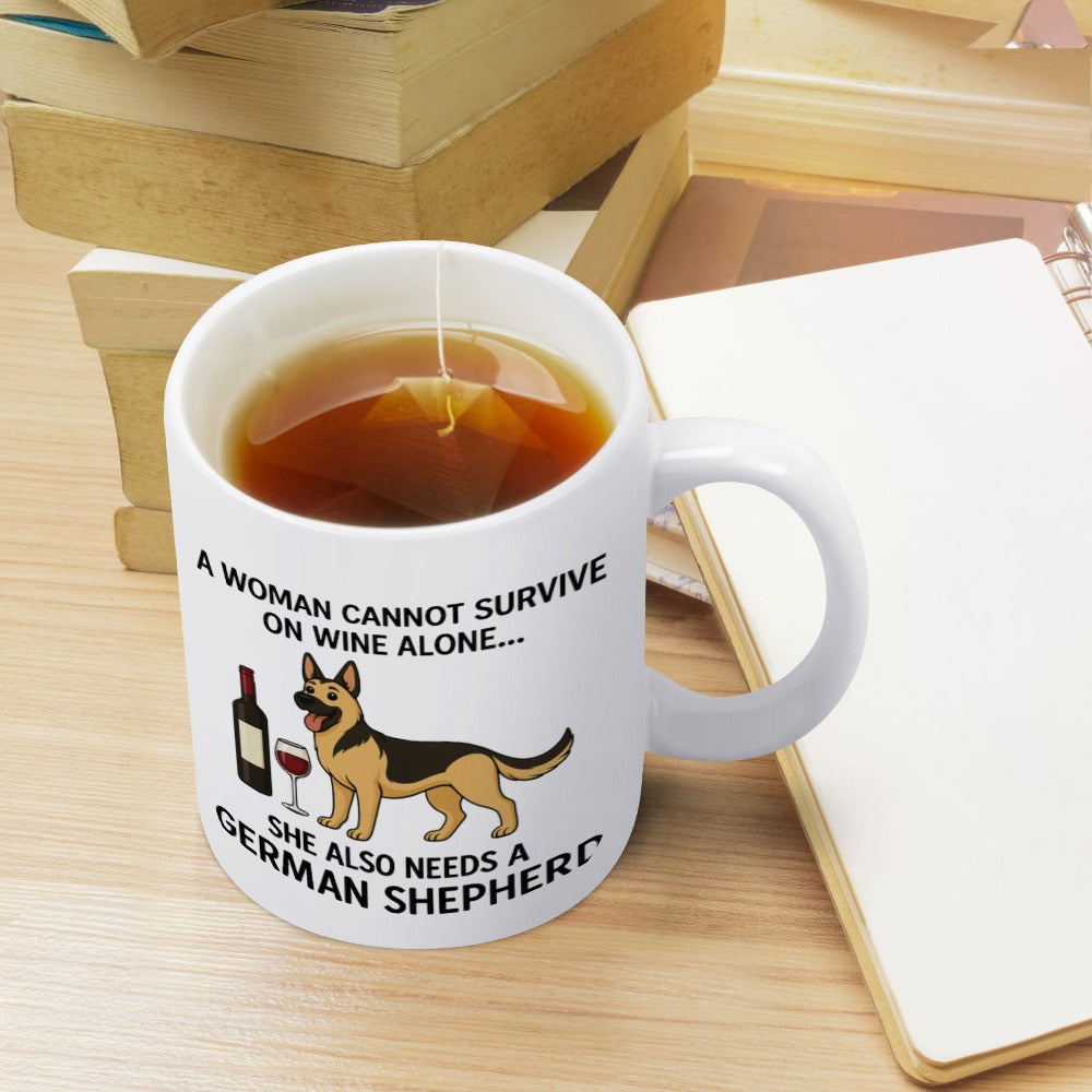Celebrate your love for your German Shepherd and your favorite beverage with our charming coffee mug! Featuring a cheerful German Shepherd alongside a bottle and glass of wine with the playful quote, “A woman cannot survive on wine alone… she also needs a German Shepherd” It’s a heartwarming reminder that life’s best moments are shared with good wine and great company — especially your furry best friend.