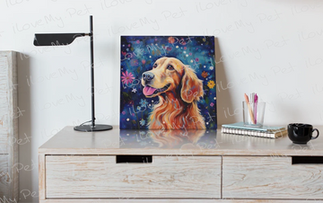 In this artistic creation, the Golden Retriever stands as a symbol of boundless joy and affection. The piece beautifully portrays the breed, known for its friendly and tolerant nature, set against a midnight blue sky adorned with floral constellations.