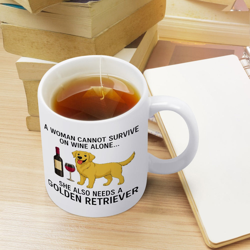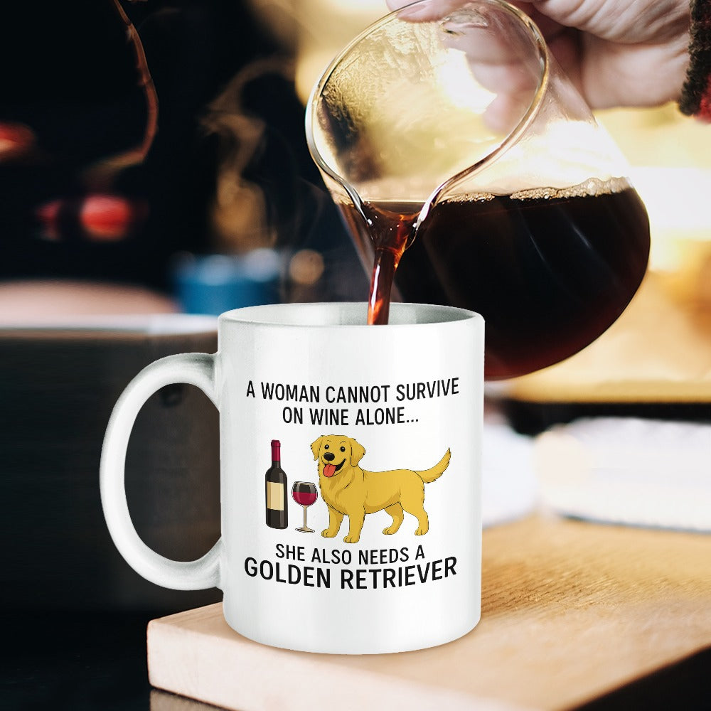 Celebrate your love for your Golden Retriever and your favorite wine with this charming coffee mug! Featuring a cheerful Golden Retriever alongside a bottle and glass of wine with the playful quote, “A woman cannot survive on wine alone… she also needs a Golden Retriever.” It’s a heartwarming reminder that life’s best moments are shared with good wine and great company — especially your furry best friend.