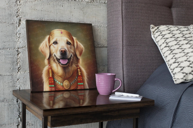 This exquisite artwork captures the regal splendor of the Golden Retriever, a breed celebrated for its friendly and tolerant nature. Dressed in traditional Indian attire that evokes the opulence of ancient rajas, this noble canine is a spectacle of cultural richness and imaginative storytelling.